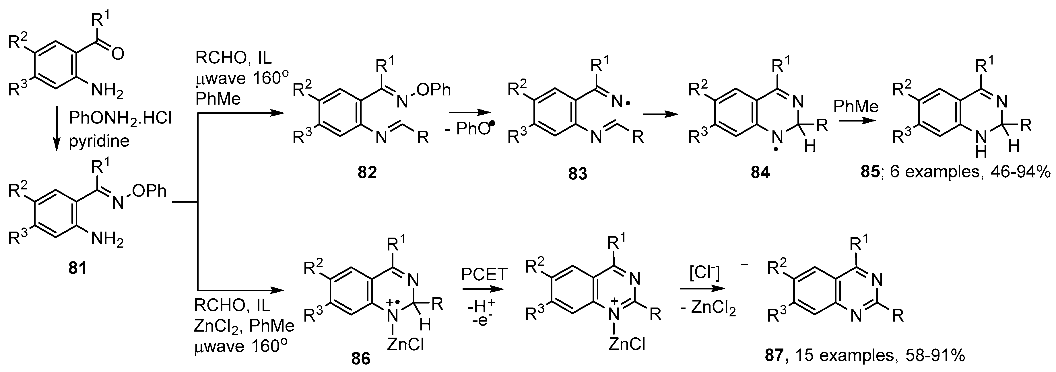 Aminoarylalkanone O-phenyl oximes 81 can be efficiently prepared from the corresponding ketones (Scheme 15). On mixing these starting materials with an aldehyde and microwave irradiating at 160 °C, in toluene as H-donor solvent, with emimPF6 as ionic liquid, imine intermediates 82 were formed. Dissociation to phenoxyl and iminyl radicals 83 took place in one pot, without the need to isolate the imine intermediates 82. Ring closure was exclusively in the 6-endo mode with production of aminyl radicals 84 that were reduced to 1,2-dihydroquinazolines 85 by H-atom donation from the solvent [98,99] (Scheme 15).