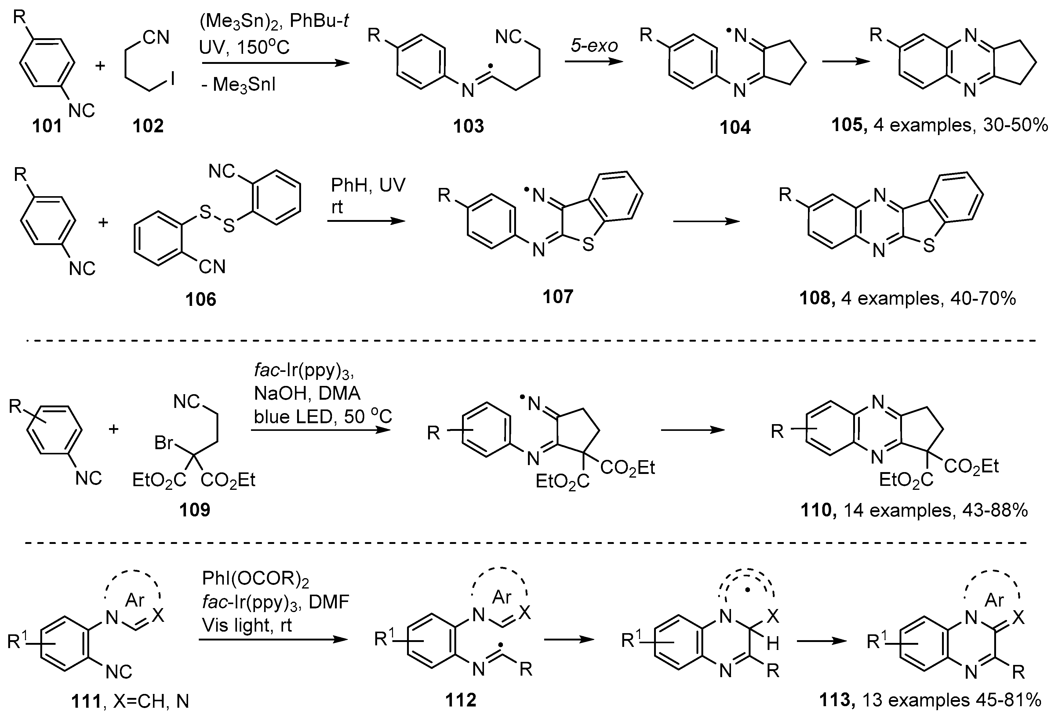 More recently, photoredox catalyzed versions of the isonitrile insertion process requiring only visible light, have been deployed for quinoxaline preparations. Sun et al. demonstrated that diethyl 2-bromo-2-(2-isocyanoethyl)malonate 109 was a suitable precursor for 3-cyano-alkyl radicals when irradiated by blue LED light in the presence of fac-Ir(ppy)3 as PC. Cyclopenta-iminyl radicals were obtained as intermediates and afforded cyclopentaquinoxalines 110 in moderate to excellent yields [117] (Scheme 18). Jamison and co-workers generated alkyl radicals from readily accessible phenyliodine(III) dicarboxylates [118] with visible light and fac-Ir(ppy)3 in DMF [119]. Their substrates were aromatic isonitriles with ortho-pyrrole or analogous heteroarene substituents 111. The alkyl radicals coupled with the isonitriles giving imidoyl radical intermediates 112 that ring closed to pyrrolo[1,2-a]quinoxalines (and related structures) 113 without the intermediacy of iminyl radicals (Scheme 18). The process was tolerant of many substituent types enabling a good range of polycyclic heteroarenes to be prepared. Efficiency was enhanced by their development of a continuous flow system that integrated isonitrile formation with the photo-redox cascade.