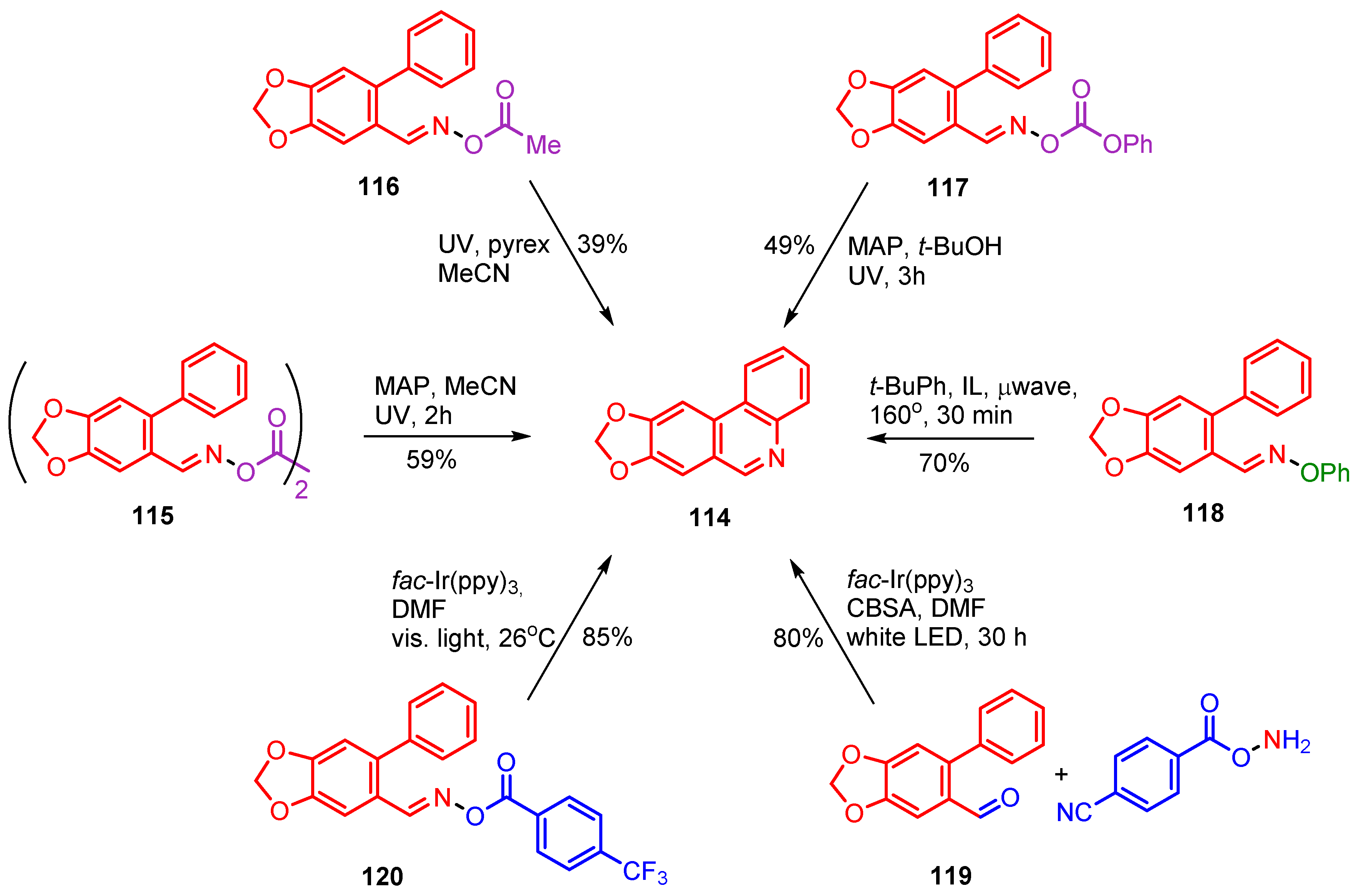 Three of these rely on UVA irradiations; all of easily prepared precursors including dioxime oxalate 115 [54], O-acyl oxime ester 116 [52] and O-phenyl oxime carbonate 117 [77]. All three precursors were made in high yields, essentially in three steps, from commercially available 6-bromopiperonal. The highest reported yield (59%) was that from dioxime oxalate 115 but it is probable that yields from all three processes could be increased by optimization studies. The μwave promoted process from O-phenyl oxime ester 118 was short, clean and comparatively efficient (70%) [57]. Compound 118 was made in high yield in two steps from 6-bromopiperonal and the reaction conditions were clean and straightforward. The two photoredox catalyzed methods starting from aldehyde 119 [80] and trifluoromethylbenzoyl oxime ester 120 [79] had the highest reported yields and reaction conditions were benign (Scheme 19). The fac-Ir(ppy)3 catalyzed preparation, starting from aldehyde 119, took only two steps from 6-bromopiperonal. It should be noted, however, that the co-reactant O-(4-cyanobenzoyl)hydroxylamine is not commercial; although it can be made in two high-yielding steps from 4-cyanobenzoyl chloride.