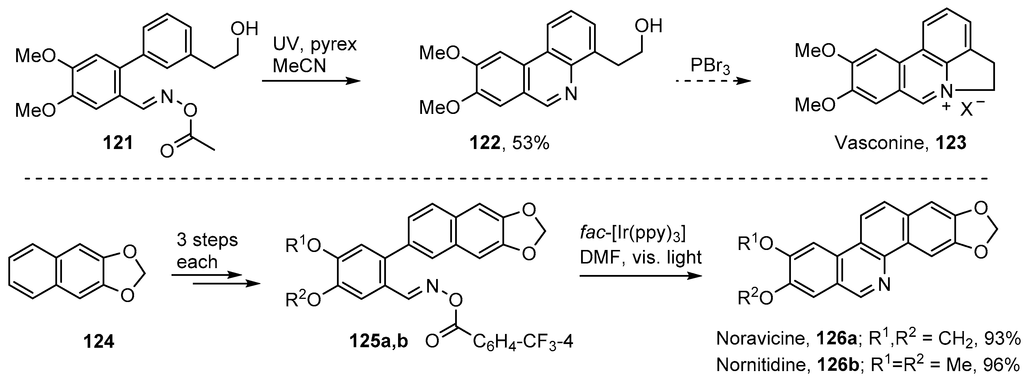 Noravicine 126a and nornitidine 126b are bioactive benzo[c]phenanthridine alkaloids with antitumor activity [127,128]. Zhang, Yu and co-workers devised short (4-steps from methylenedioxy-naphthalene 124) and high yielding total syntheses employing their photoredox strategy with oxime esters 125a and b [79] (Scheme 20).