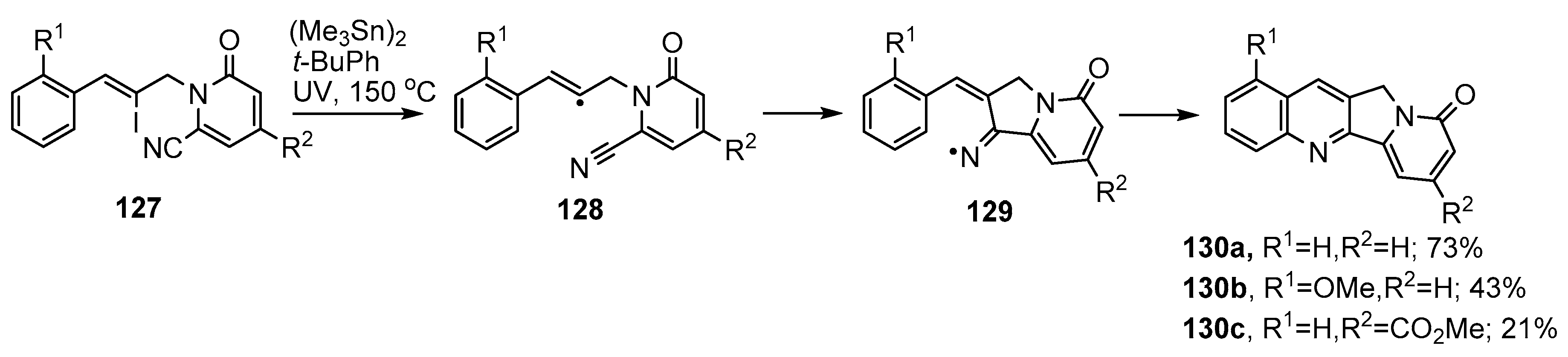 Bowman and co-workers implemented an iminyl radical cascade synthetic protocol for the tetracyclic rings A–D of heterocycles containing the indolizino[1,2-b]quinolin-9(11H)-one 130a unit [142,143] (Scheme 21). The starting vinyl iodides 127 were assembled in four steps from cinnamaldehyde derivatives and cyanopyridones and then UV irradiated with hexamethylditin in t-BuPh at 150 °C. The initial vinyl radicals 128 ring closed onto the nitrile group in 5-exo mode producing iminyl radicals 129 that underwent cyclisation and re-aromatization to afford tetracycles 130a–c.