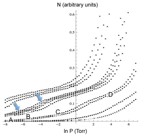 Adsorption isotherms for Ne at temperatures between 18.7 K and 49.8 K. The arrows indicate the bumps, and the labels A to D correspond to the configurations shown in Figure 3.