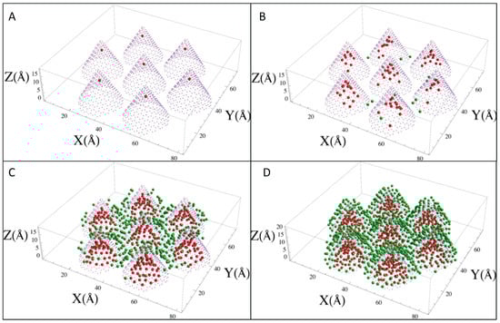 Carbon nanohorns have two main sites of adsorption: inside the cones near the tip and in the external interstices between cones. We designed a simple version of the nanohorns, consisting of an array of seven “graphene” cones on the 8.0 nm × 8.7 nm base of the simulation cell (see Figure 1). The cones are identical, with 2 nm-diameter bases and 1.5-nm heights. Although the model lacks the spherical curvature typical of a dahlia-shaped arrangement, it holds the main features that are important for adsorption: interstices and conical tip. The boundary conditions are set reflective in the z direction and periodic in .