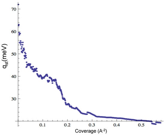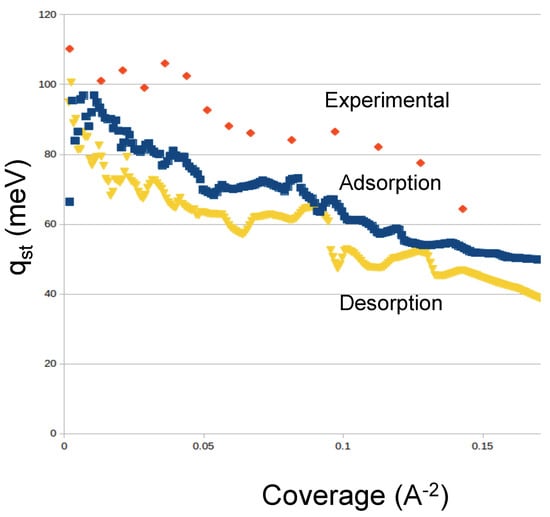 where n is the coverage and P is the vapor pressure at the given . We compute the from the adsorption isotherms at a constant value of n. The result is displayed in Figure 4, which can be compared to the experimental result from [19].