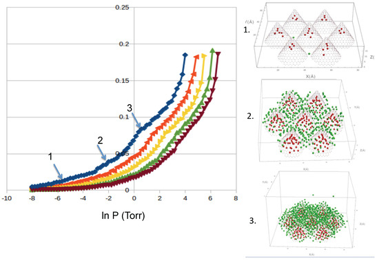 Adsorption isotherms of argon (in Å), at temperatures of 70.32, 81.51, 86.45 and 91.13 K (from left to right). Also shown are configurations at low (1); medium (2) and high (3) coverage, as labeled. Color code: atoms inside the cones (red) and outside (green).