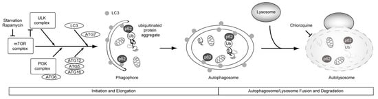 Overview of autophagy. Nutrient depletion and stress signaling, trigger autophagosome formation upon mTOR (mammalian target of rapamycin) inhibition (Initiation and Elongation). Subsequently, we describe the fusion of autophagosome with lysosome, and degradation. Autophagy is primarily non-selective. In selective autophagy, ubiquitin-binding autophagic adaptors, such as p62, play an important role in this process and selectively recognize the autophagic cargo (the inner surface of the growing phagophore), mediating its engulfment into autophagosomes, by binding to the small ubiquitin-like modifiers that belong to the LC3 (microtubule-associated protein light chain 3) family. ATG is an abbreviation for “autophagy-related”.