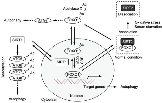 Autophagy regulation by SIRT1, SIRT2, and FOXO1.The autophagy levels are increased and decreased by SIRT1 and SIRT2, respectively. FOXO1 regulates the expression of multiple autophagy-related genes, including ATG5, ATG6, ATG8, ATG12, Rab7 (a member of RAS-related GTP-binding proteins), and Bnip3 (BCL2/Adenovirus E1B 19kDa Interacting Protein 3) [55,56,57,58,59]. There are at least six ATG8 homologues in mammalian cells, and LC3 is one of the ATG8 homologues.