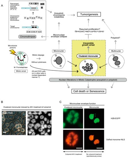 Two conventional nuclear alterations, and a new type, in mitotic catastrophe. (A) Conventional micronuclei can be a source for chromothripsis, which may lead to chromosome instabilities and tumorigenesis. In contrast, clustered micronuclei are thought to have a low chance to cause such genomic instabilities, since they could reach irreversible growth arrest and possess functional micronuclear envelopes as shown in Figure 4C. Cells with multinuclei may also contribute to tumorigenesis. Black arrows indicate a challenging, but not established, beneficial effect converting any of the nuclear alterations into clustered micronuclei. For details, see the text; (B) Morphological features of clustered micronuclei in mouse A9 cells are shown. DsRed monomer-NLS allows the production of monomeric DsRed protein fused to a nuclear localization signal. After 48 h of treatment with colcemid, clustered micronuclei are visible via light microscopic observation. Scale bars; 20 μm; (C) Each micronucleus within clustered micronuclei possesses a functional micronuclear envelope, but not micronuclei. Note that the micronuclei showed in the right panels arose spontaneously and are observed in a giant cell that has two large nuclei with three independent very small nuclei without functional nuclear envelope. Scale bars; 20 μm.
