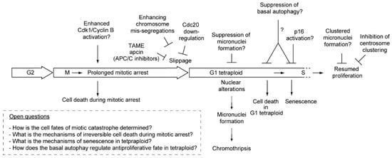 The mechanisms governing antiproliferative fate in tetraploid cells are not well understood compared to cell death during mitotic arrest. The third aim of this review is to expose our studies suggesting that autophagy regulation is involved in this process.