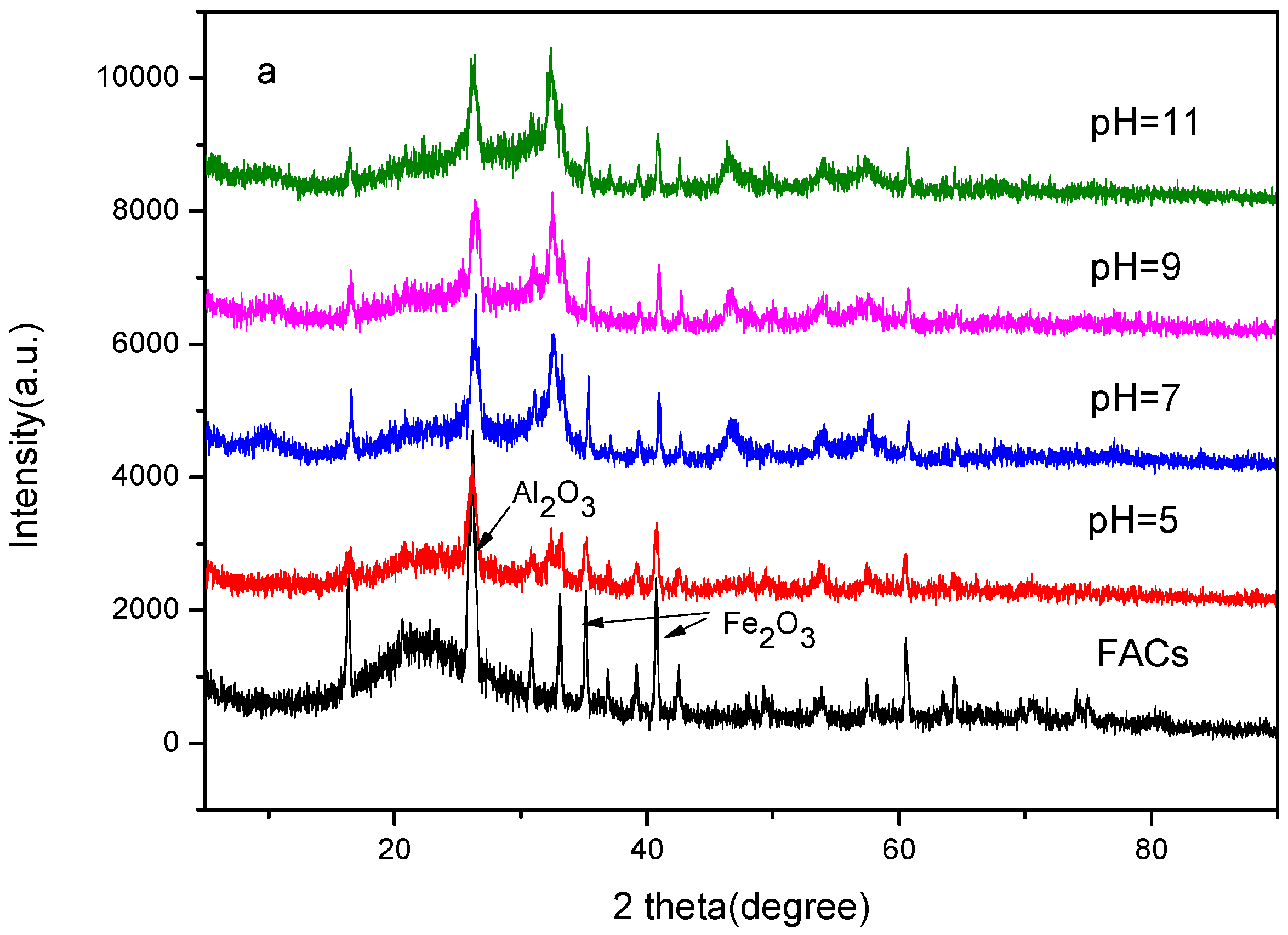 The XRD spectra of FACs and different pH series samples are shown in Figure 1a, where the X-ray diffraction pattern of all the products can be indexed as the tetragonal phase 50%BiOBr/BiOI [7,15,17]. For comparasion, the X-ray diffraction pattern of BiOBr/FACs and BiOI/FACs obtained at pH 9 are also shown in Figure 1b, where the corresponding diffraction peaks can be indexed to the tetragonal BiOI phase (JCPDS card No. 10-0445) and the tetragonal BiOBr phase (JCPDS card No. 09-0393), respectively. The results indicate that BiOBr/BiOI is successfully coated on the surface of FACs. In addition, according to the XRD spectra of FACs carriers, some SiO2, Fe2O3 and Al2O3 peaks are all clearly seen in low pH samples, because the FACs are aluminosilicate-based ceramic particles and the main components of FACs are siliceous oxide, ferrous oxide and aluminous oxide, etc. [18]. However, with increasing pH value, the intensity of the SiO2, Fe2O3 and Al2O3 diffraction peaks is weakened as more BiOBr/BiOI is loaded on the FACs surface. Simultaneously, although possessing a consistent characteristic, the inflection peak intensity of BiOBr/BiOI loaded at high pH values is increased relative to that at low pH value. This results suggests that the increase of pH value is beneficial for the loading of BiOBr/BiOI on FACs, which may be favourable for the photocatalytic ability.