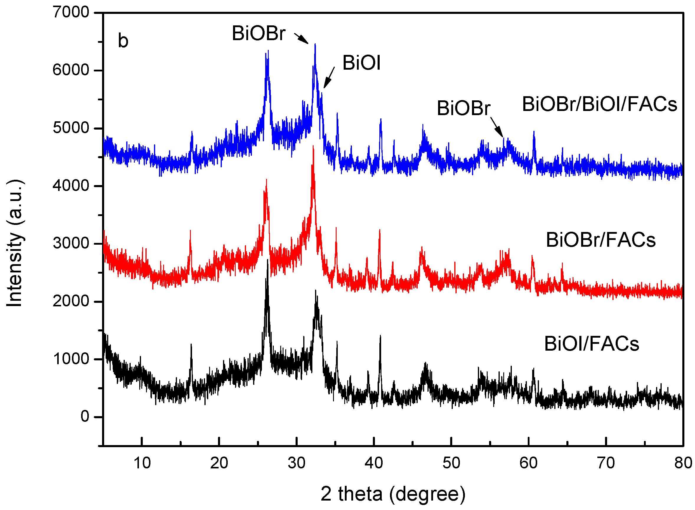 The white sol-gel formed at higher pH could be easily adsorbed on the surface of FACs so that large number of photocatalyst precursor can be coated on them [20]. This is the key factor for the improvement of the photocatalytic properties under alkaline synthesis conditions. This mass increase of the coated BiOBr/BiOI has been verified by the SEM and XRD analysis.