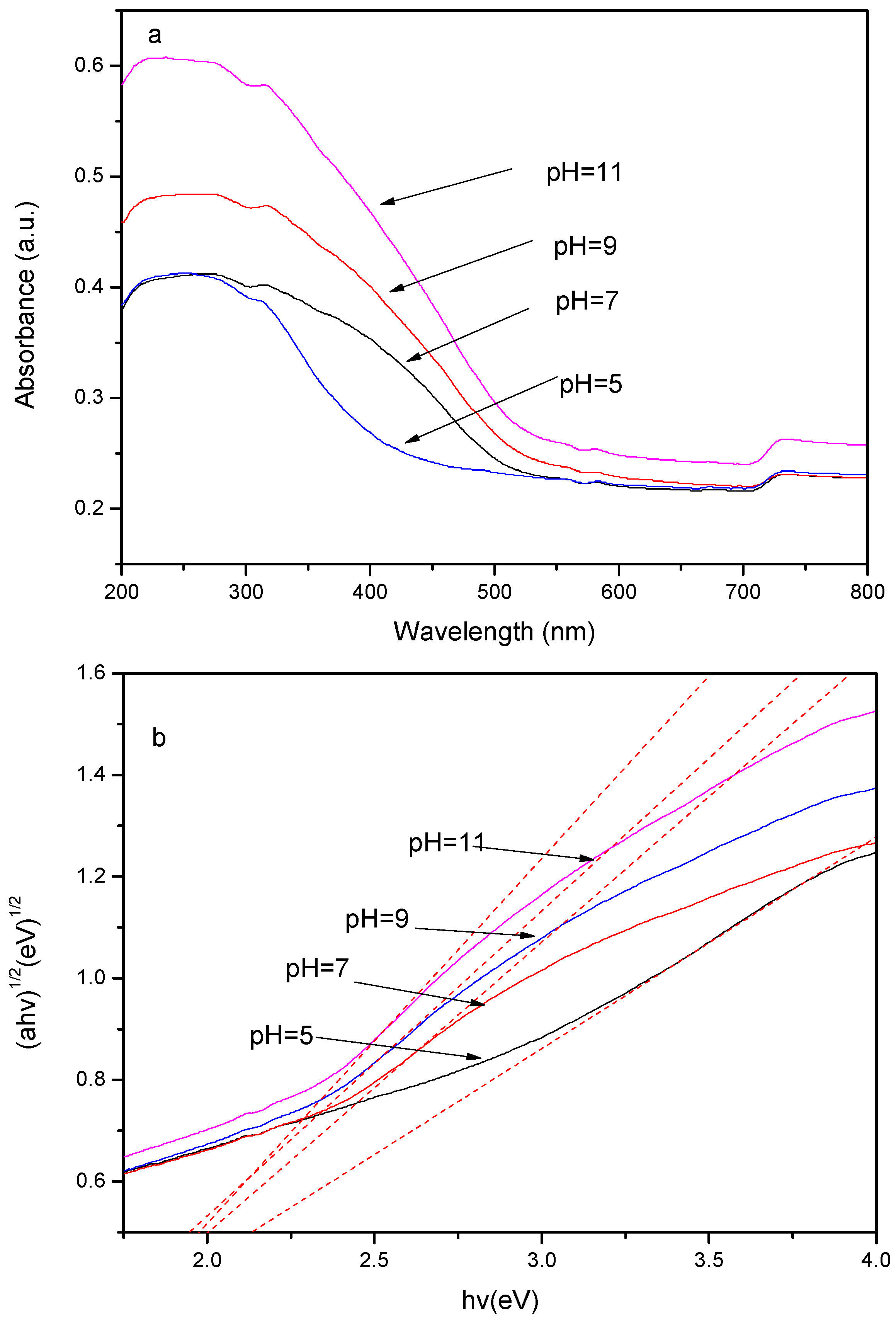 The UV-vis diffuse reflection spectra of a series of different pH samples (a) and plots of (αhγ)1/2 vs. photon energy (b).