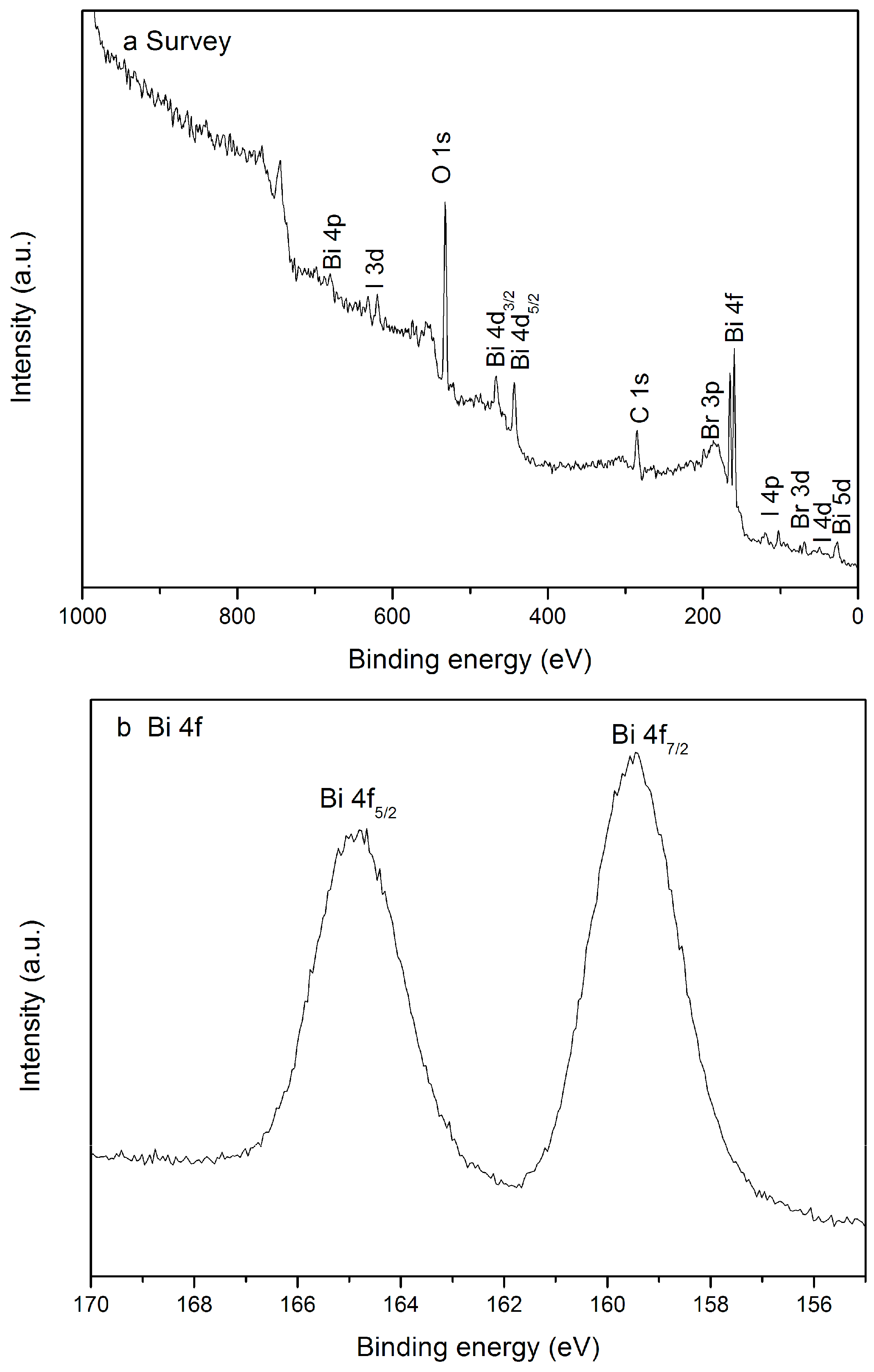 The survey XPS spectra are shown in Figure 4. The results indicate that the Bi, Br, I and O elements are definitely detected in the as-prepared BiOBr/BiOI/FACs composites. The C 1s peak at 284.8 eV may originate from adventitious hydrocarbon contaminants in the XPS instrument analysis [24]. Figure 4b shows the high-resolution XPS spectrum of Bi 4f. The peaks with binding energy of 159.4 and 164.8 eV are separately ascribed to the Bi 4f7/2 and Bi 4f5/2, respectively, which is characteristic of the Bi3+ in the samples [25,26]. In Figure 4c, the peak located at 68.6 eV is assigned to the Br 3d peak, corresponding to the characteristics of the Br− in the as-prepared materials [25]. The XPS I 3d spectrum in Figure 4d shows two peaks at 631.0 and 619.5 eV, which can be ascribed to I 3d3/2 and I 3d5/2, respectively [24,25]. Besides, Figure 4e shows the high-resolution XPS spectrum for the O 1s region that can be fitted to two peaks. The main peak at 530.4 eV is attributed to the Bi-O bonds in (BiO)22+ slabs of the BiOX layered structure, and the peak at 532.1 eV is assigned to the hydroxyl groups on the surface [27,28]. The XPS quantification report of the as-synthesized BiOBr/BiOI/FACs samples obtained at pH 9 is illustrated in Table 1. According to the XPS analysis results, the I− atomic concentration is lower than the theoretical value, which may be induced by the the loss of I− in the open oven system at 160 °C.