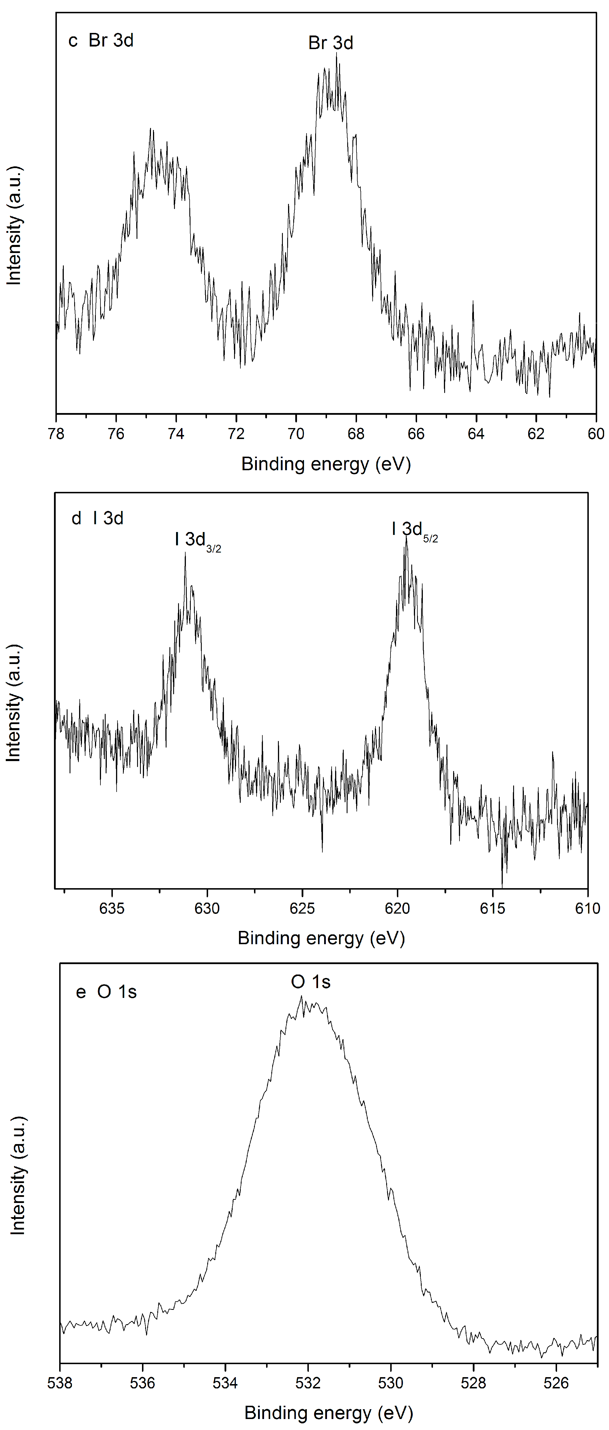 XPS spectra of as-prepared sample (pH = 9): (a) survey; (b) Bi 4f; (c) Br 3d; (d) I 3d and (e) O 1s.