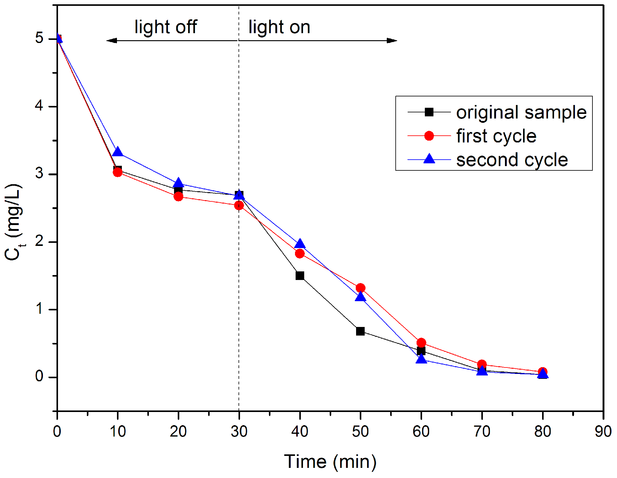 The photocatalytic experiments are carried out by using a 50 W blue LED lamp with a wavelength of 450 nm as the visible light source, which is placed about 5 cm from the surface of a liquid suspension of RhB. In each experiment, photocatalyst (0.1 g) was added to RhB solution (50 mL) with an initial concentration of 5 mg/L, The pH value didn’t change in reaction suspension system. Before irradiation, the suspension is stirred for 30 min in the dark to reach adsorption-desorption equilibrium. At given time intervals, approximately 2 mL of the suspension is filtered to remove the photocatalyst particles and the clarified solution is analyzed by UV–Vis spectroscopy.