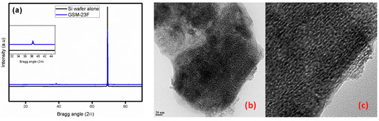 Wide angle XRD spectra of the bare silicon wafer and the GSM-23F film (a) TEM analysis of the GSM-23F thin film with different magnifications, scale bars (b) 20 nm and (c) 10 nm.