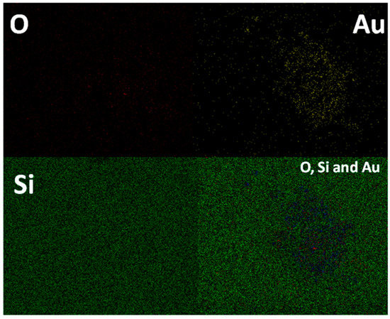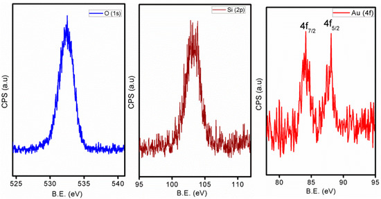 Nitrogen adsorption-desorption of the bulk form of these mesoporous thin films showed a type-IV isotherm (Figure S4). The BET surface area is found to be 545 m2·g−1 and the pore size to be 3.5 nm. This pore size value is consistent with that obtained from the TEM analysis. To explore the chemical composition of the active nanoparticles we did XPS analysis (Figure 2). The results clearly indicate the existence of gold in the zero valent state with a Au(4f7/2) feature ate 84 eV. The O1s and Si(2p) binding energy value are also consistent with the silica values. These metallic gold nanoparticles are known for their catalytic activity as well as SERS enhancement.