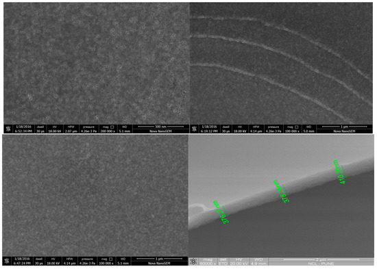 Scanning electron microscopy images of the thin film GSM-23F on various magnifications and the cross-sectional analysis of such a thin film.