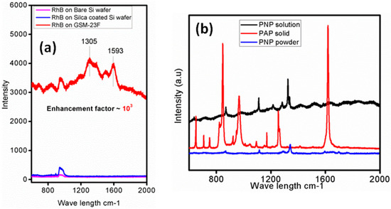 SERS spectra of rhodamine B on GSM-23F thin film and the bare silicon substrate (a) and the Raman spectra of the 4-nitrophenol (PNP), 4-aminophenol (PAP) (b) under 633 nm laser excitation source.