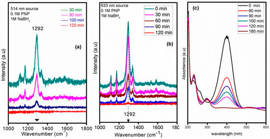 As we were unable to detect the peak corresponding to the –NH2 peak in the Raman spectra after the reaction (though the –NO2 peak had completely vanished), the formation of PAP is further confirmed by UV-Vis spectra (Figure 6c). The experimental conditions of the UV-Vis and Raman analysis were same; hence there should be no ambiguity in comparing the results. Emergence of a peak at 300 nm with time and the decrease in the peak intensity at 400 nm clearly validate the reduction of PNP with sodium borohydride in the presence of GSM-23F.