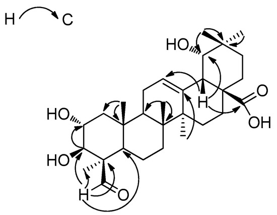 Compound 1 was obtained in the form of a white amorphous powder. The molecular formula was determined to be C30H46O6 by the HR-ESI-MS peak at m/z 503.3349 [M + H]+ (calcd. for C30H47O6, 503.3294). Its IR spectrum exhibited absorptions that corresponded to hydroxyl (3454 cm−1) and ester carbonyl (1697 cm−1) groups. The 1H-NMR spectrum of 1 displayed signals for six tertiary methyl groups at δH 1.64 (H-27), 1.58 (H-23), 1.21 (H-29), 1.13 (H-30), 1.01 (H-26), and 0.95 (H-25), one olefinic proton at δH 5.57 (H-12). According to the 13C-NMR, HMBC and DEPT spectra, 30 carbon signals were assigned, including a carboxylic carbon at δC 181.2 (C-28), one trisubstituted carbon-carbon double bond system at δC 145.3 (C-13) and 123.3 (C-12), two oxygenated methine carbons at δC 82.7 (C-3) and 68.8 (C-2), and one oxygenated methyl carbon at δC 81.6 (C-19), which suggested the presence of an olean-12-ene skeleton. The 13C-NMR spectrum of 1 displayed the same signals as those recorded for paradrymoniside (compound 2) [16], except the signal at δC 181.2 (C-28), corresponding to the carbon of the esterification by a glucose, which was shifted to downfield by 3.6 ppm as a carboxylic carbon. In addition, the 1H-NMR spectrum displayed a signal at δH 10.45, and the 13C-NMR spectrum showed a peak at δC 207.7. These data were consistent with the presence of an aldehyde group. Its position on ring A was deduced by comparison of 13C-NMR data for 1 with those of arjunic acid (compound 7) [17], of which the signal of C-4 (δC 41.0) was shifted to upfield by 15.3 ppm. The location of the aldehyde group at the C-24 position was deduced by the chemical shifts of C-23 and C-24, which could be compared the differentiation of the 13C-NMR chemical shifts between the β-methyl group (23-oxygenated triterpenes) and the α-methyl group (24-oxygenated triterpenes) [16]. Besides, the connectivity of the aldehyde group was further confirmed by the HMBC correlations. The correlations in HMBC (Figure 2) were observed between H-24 and C-3 (δC 82.7), C-23 (δC 22.3), and C-4 (δC 55.5). The 1H NMR spectrum also exhibited signals for two carbinol methines at δH 4.60 (1H, ddd, J = 12.0, 9.5, 4.6 Hz) and 3.64 (1H, d, J = 9.5 Hz), which were assigned to H-2β and H-3α in ring A. The relative configuration could also be confirmed by the NOESY spectrum (Figure 3), where correlations could be observed between H-2 and H-25 (β), H-3 and H-5 (α, δH 1.31), suggesting a 2α,3β-dihydroxy grouping. A 2α,3β,19α-trihydroxy moiety can also be inferred by comparison of the chemical shifts of compound 2 (δC 68.8 (C-2), δC 82.7 (C-3), 81.4 (C-19)). Moreover, a correlation between δH 10.45 and H-2 provided further confirmation of the location of the aldehyde group at C‑24. Thus, with the analysis of 2D NMR, compound 1 was elucidated to be 2α,3β,19α-trihydroxy-24-oxo-olean-12-en-28-oic acid. The proton and carbon signals are listed in Table 1.