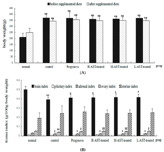 Effect of AST on the (A) body weight and (B) tissue indices of aged senile rats (n = 8 per arm). Normal group, non-aged (treated with vehicle); control group, aged (treated with vehicle); Progynova group, treated with Progynova 0.18 mg/kg; H-AST-treated group, M-AST-treated group, and L-AST-treated group, treated with AST 70, 35 and 7 μmol/kg, i.g., respectively. Results are presented as mean ± SEM. * p < 0.05, ** p < 0.01, control group, Progynova group, H-AST-treated group, M-AST-treated group, and L-AST-treated group versus normal group; # p < 0.05, ## p < 0.01, Progynova group, H-AST-treated group, M-AST-treated group, and L-AST-treated group versus control group.