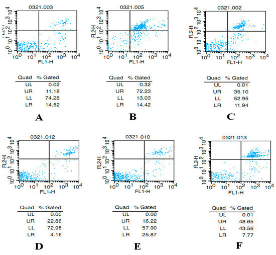 Reduction of ovarian granulosa cell apoptosis in aged female rats after treatment with increasing concentrations of AST. Apoptosis rate was determined by flow cytometry after staining with Annexin-V-FITC and propidium iodide. (A) Normal group, non-aged (treated with vehicle); (B) control group, aged (treated with vehicle); (C) Progynova group, treated with Progynova 0.18 mg/kg; (D) H-AST-treated group, treated with AST 70 μmol/kg; (E) M-AST-treated group, treated with AST 35 μmol/kg; (F) L-AST-treated group, treated with AST 7 μmol/kg.