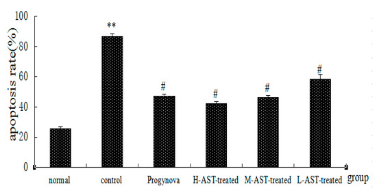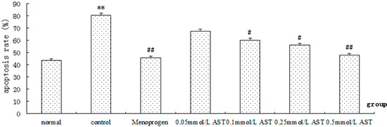 Effect of AST on the apoptosis rate of ovarian granulosa cells in aged female rats (n = 3 per arm). Apoptosis rate % = the number of apoptosis cells / (the number of apoptosis cells + the number of normal cells) × 100%. Normal group, non-aged (treated with vehicle); control group, aged (treated with vehicle); Progynova group, treated with Progynova 0.18 mg/kg; H-AST-treated group, M-AST-treated group, and L-AST-treated group, treated with AST 70, 35 and 7 μM/kg, i.g., respectively. Results are presented as mean ± SEM. ** p < 0.01, control group, Progynova group, H-AST-treated group, M-AST-treated group, and L-AST-treated group versus normal group; # p < 0.05, Progynova group, H-AST-treated group, M-AST-treated group, and L-AST-treated group versus control group.