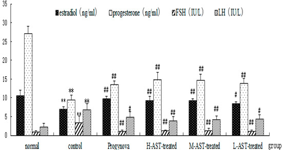 Effect of AST on hormone levels in the sera of aged senile rats (n = 8 per arm). Normal group, non-aged (treated with vehicle); control group, aged (treated with vehicle); Progynova group, treated with Progynova 0.18 mg/kg; H-AST-treated group, M-AST-treated group, and L-AST-treated group, treated with AST 70, 35 and 7 μM/kg, respectively. Results are presented as mean ± SEM ** p < 0.01, control group, Progynova group, H-AST-treated group, M-AST-treated group, and L-AST-treated group versus normal group; # p < 0.05, ## p < 0.01, Progynova group, H-AST-treated group, M-AST-treated group, and L-AST-treated group versus control group.