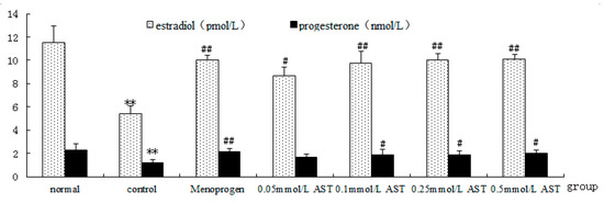 Effect of AST on hormone secretory activity of cultured GC measured by RIA assay (n = 10). Normal describes GCs from normal 4-month old female rats; control represents GCs from the naturally aged 14-month old rats. Isolated GCs were incubated in absence or presence of increasing concentrations of AST or Menoprogen. The experiment was repeated five times, two-well/each time. Results are presented as mean ± SEM. ** p < 0.01, control group versus normal group; # p < 0.05, ## p < 0.01, all treatment groups versus control group.
