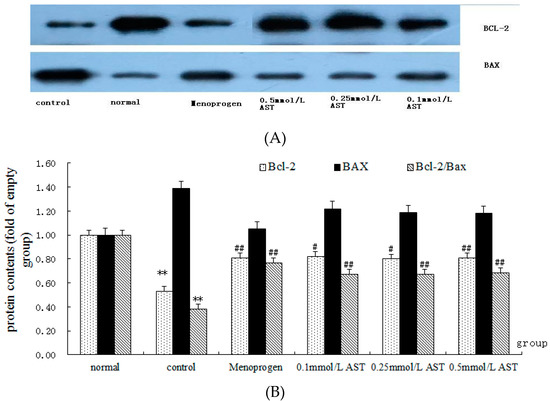 Granulosa cells were cultured in 16-well plates at 1 × 106 cells/mL (1.0 mL/well), and were randomly allocated to Menoprogen group, three AST groups and one normal PBS group (4 well/group), and cultured in serum-free medium. After 24 h, the cells in the control groups were cultured with AST at increasing concentrations (0.05–0.5 mmol) and the cells in the normal group were cultured with the same volume of PBS. After additional incubation for 24 h, the cells were washed twice and then processed with 20 μL of NP-40 lysis buffer containing protease inhibitors. A BCA method was used to determine the protein concentration in each well. Ten to 20 μg of whole cell extract from each well was loaded on each corresponding lane of 4% to 10% polyacrylamide gel. The Tricine-SDS-PAGE polyacrylamide gel electrophoresis was carried out with the voltage setting at 60 V for the concentrated gel and 150 V for the separating gel. A wet-transfer system (Mini Trans-Blot Cell, Bio-Rad Laboratories, Inc.) was used to transfer the protein contents from the gel to the membrane (PVDF, 200 mA for 60 min). After incubation with 5% bovine serum albumin (HyClone, dissolved in PBS) for 2 h at room temperature, blocking the non-specific bindings, the membrane was incubated with one of the primary antibodies, rabbit polyclonal antibody to Bcl-2 (1:500, Abcam, local agency of Nanjing Saiyan Bioengineering Institute, Nanjing, China), to GAPDH (1:500) or to Bax (1:500, Santa Cruz Biotechnology, Inc., local agency of Nanjing Saiyan Bioengineering Institute, Nanjing, China) at 4 °C overnight. The membrane was incubated with the secondary antibody (goat-anti-rabbit HRP conjugated antibody, 1:1500, Santa Cruz Biotechnology, Inc.) at 4 °C for 2 h. The ECL chemical luminescence method was employed to detect and analyzed the target protein using the Gel Image Analysis System and ChemiDoc MP Imaging System (Bio-Rad). Changes in protein level were determined using the Bio-Rad’s stain-free technology and presented as fold of the normal group. The experiment was repeated three times.
