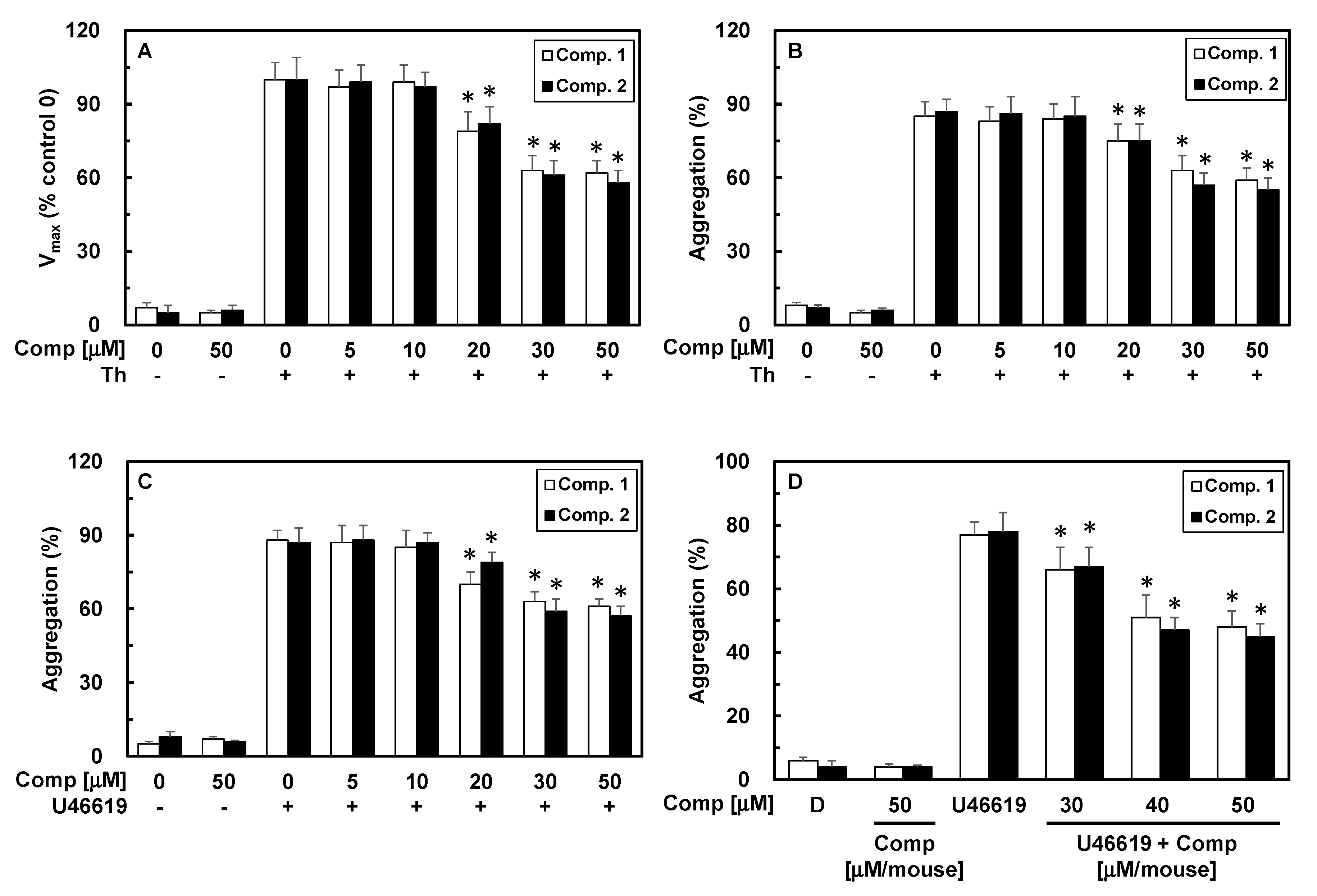 Effects of 1 or 2 on fibrin polymerization in human plasma. (A) Thrombin-catalyzed fibrin polymerization at the indicated concentrations of 1 or 2 was monitored using a catalytic assay, as described in the “Experimental Section”. The results are Vmax values expressed as percentages versus controls; (B) Effect of 1 or 2 on mouse platelet aggregation induced by 3 U/mL thrombin; (C) The effect of each compound on human platelet aggregation induced by 2 mM U46619; (D) The indicated amount of each compound concentration in DMSO was injected intravenously. The effects of each compound on mouse platelet aggregation induced by 2 μM U46619 were monitored ex vivo. D = 0.2% DMSO is the vehicle control. Data represent the mean ± SEM of three independent experiments performed in triplicate. * p < 0.05 vs. Th or U46619 alone.