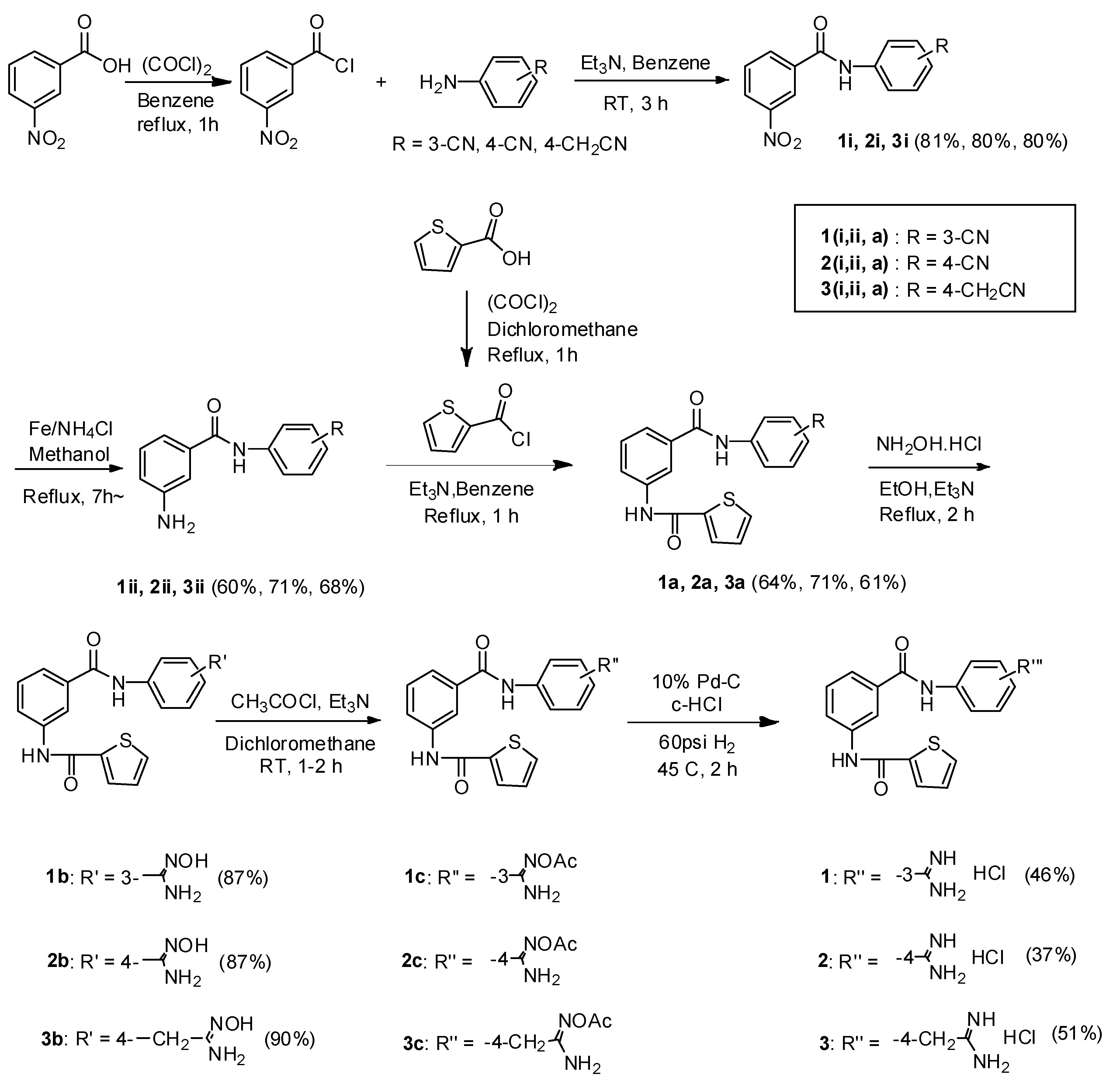 The first side chain was introduced through acylation of 3-nitrobenzoyl chloride with 3-cyano-, 4-cyano-, and 4-cyanomethylaniline to give 1i–3i. The nitro group of these 3-nitrobenzamides was reduced by NH4Cl and Fe to give amines 1ii–3ii. An acylation with thiophene-2-carbonyl chloride provided the N-(thiophene-2-carbonyl) 3- or 4-cyanophenylbenzamides 1a and 2a, and the N-(thiophene-2-carbonyl) 4-cyanobenzylbenzamid 3a, which were converted to amidoximes 1b–3b by treatment with hydroxylamine·HCl and triet-hylamine. The N–O bond of amidoximes 1b–3b was converted to amidinium chloride 1–3 via the O-acetyl amidoximes 1c–3c and catalytic hydrogenated over 10% Pd/C in the presence of c-HCl at 60 psi, 45 °C for 2 h. In the 1H-NMR spectra, the four proton peaks of amidinium chloride in 1 were identified as one broad singlet at 9.45 ppm, and otherwise the four proton peaks of amidinium chloride in 2 and 3 were identified, respectively, as two broad singlets at 9.17 and 9.36 ppm and at 8.83 and 9.28 ppm in the 1H-NMR spectra. Two NH proton peaks of compound 2 were confirmed by observing the correlation of NH (10.78 ppm) and CO (164.9 ppm) of the –NHCO group and of NH (10.63 ppm) and CO (166.1 ppm) of the –CONH group in the HMBC spectrum, respectively.