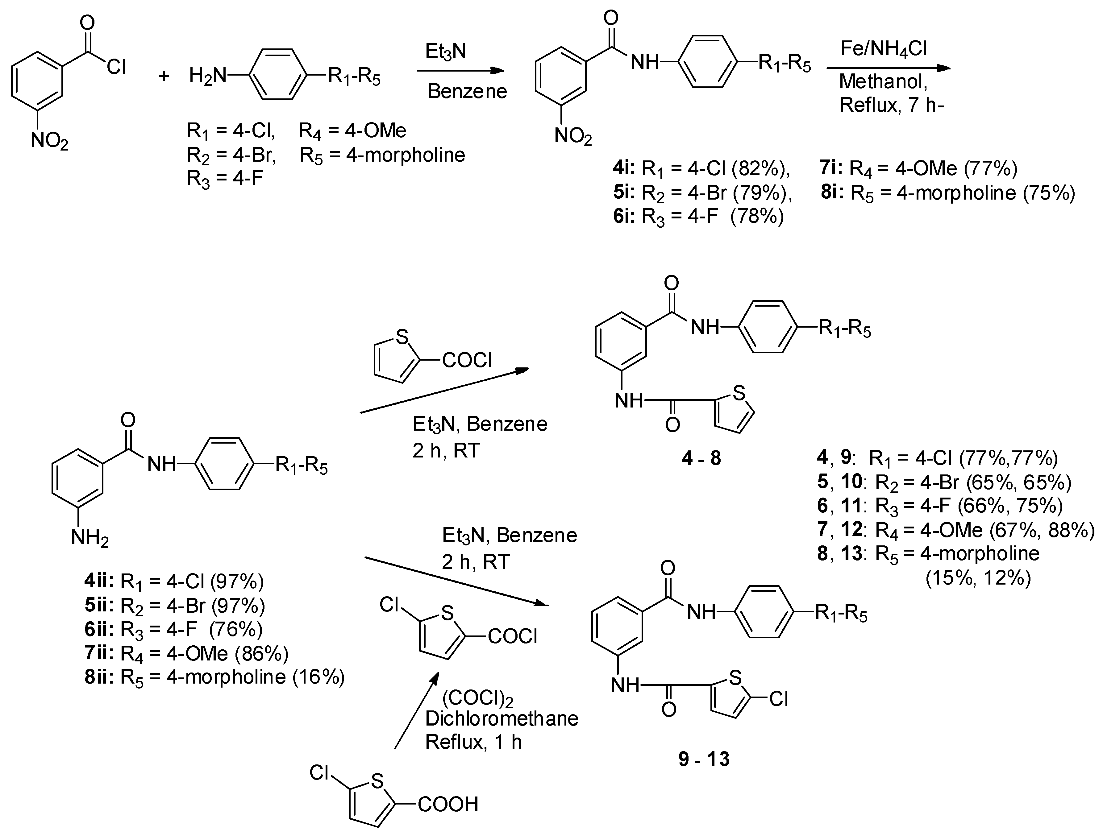 Instead of a basic amidine group, neutral substituents which improve oral bioavailability and are still capable of maintaining hydrogen bonding with the enzyme are required for FXa and thrombin inhibitors. Anilines containing 4-chloro-, 4-bromo-, 4-fluoro-, 4-methoxy-, and 4-morpholine as a neutral substituent were coupled with 3-nitrobenzoyl chloride to synthesize the corresponding 3-nitrobenzamide derivatives 4i–8i, respectively, in Scheme 2. The reduction of the nitro group of 4i–8i with NH4Cl and Fe produced the 3-aminobenzamides 4ii–8ii. The second acylation of 4ii–8ii was performed by treatment with thiophene-2-carbonyl chloride to give 4–8 and also 5-chloro-thiophene-2-carbonyl chloride to give 9–13, respectively.