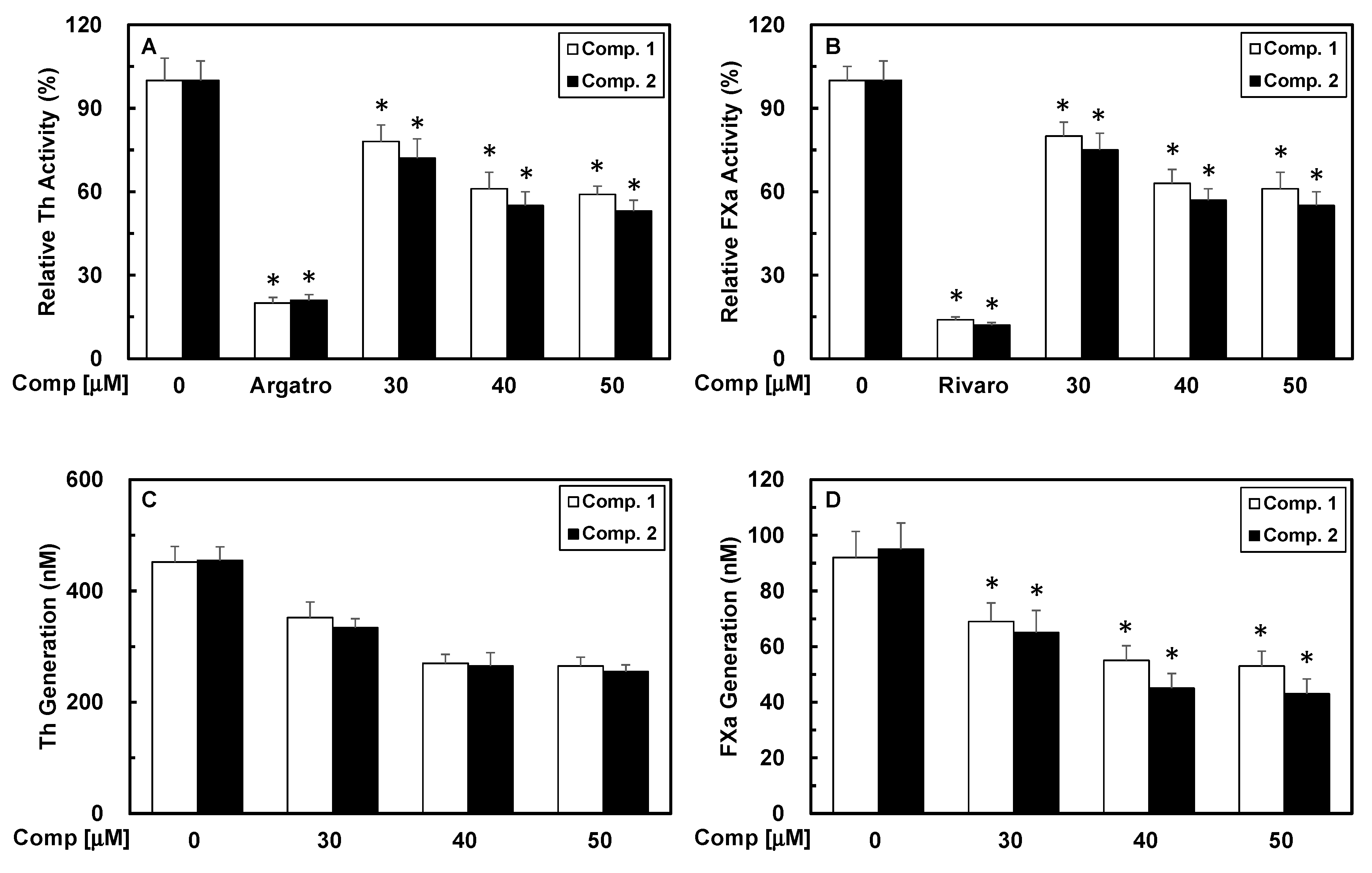 N-(3′-Amidinophenyl)-3-(thiophen-2′′-ylcarbonylamino) benzamide·HCl (1). Yield: 46%; m.p.: 219–220 °C; 1H-NMR (400 MHz, DMSO-d6) δ: 7.23 (1H, dd, J = 5.0, 3.8 Hz, H-4′′), 7.55–7.50 (2H, m, H-5,4′), 7.60 (1H, t, J = 7.9 Hz, H-5′), 7.76 (1H, d, J = 8.1 Hz, H-6), 7.87 (1H, dd, J = 5.0, 1.0 Hz, H-5′′), 8.03 (1H, ddd, J = 8.2, 2.3, 1.0 Hz, H-4), 8.08 (1H, dd, J = 8.0, 1.2 Hz, H-6′), 8.24 (1H, dd, J = 3.7, 0.7 Hz, H-3′′), 8.32 (1H, t, J = 1.8 Hz, H-2′), 8.38 (1H, t, J = 1.8 Hz, H-2), 9.45 (4H, br s, hydrogens of amidine·HCl), 10.68 (1H, s, NHCO), 10.72 (1H, s, CONH); 13C-NMR (100 MHz, DMSO-d6) δ: 119.5 (C-2′), 120.0 (C-2), 122.7 (C-6), 123.1 (C-6′), 123.7 (C-4), 125.1 (C-4′), 128.1 (C-5), 128.7 (C-4′′), 129.0 (C-3′′), 129.3, 129.5 (C-5′), 132.1 (C-5′′), 135.0 (C-1), 139.1 (C-3), 139.7 (C-2′′), 139.8 (C-1′), 160.1 (carbon of amidine), 165.9 (CONH), 166.3 (NHCO); FAB-MS m/z: 365 [M − Cl]+, 388 [M − Cl + Na]+; HRMS (EI): Calcd for C19H17N4O2S [M + H]+ 365.1072, found 365.1067.