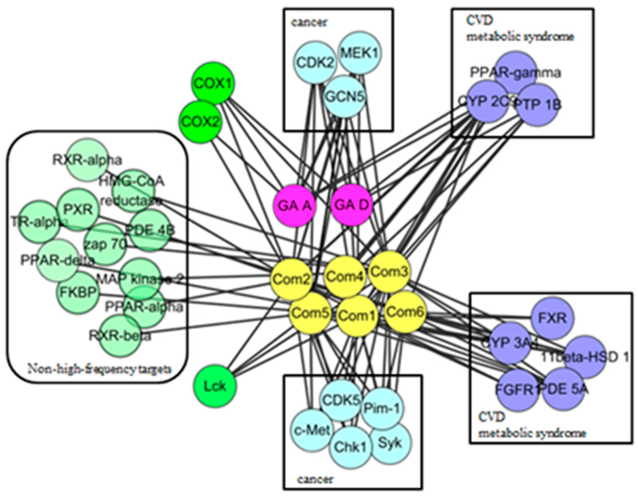 In order to observe the biological effect of GTs visually, ingredient-target network of GTs was constructed in Figure 2. According to the classes of corresponding diseases and the number of interactive compounds for each target, 19 high frequency targets were obtained, which could interact with more than one compound. As shown in the top of network, eight targets interacted with GA-A and GA-D could also be hit by the other six GTs, including CYP2C9, CDK2, PPAR γ, GCN5, MEK1, PTP1B, COX1, and COX2. It indicated that GTs might have common pharmacological activities related to cancer, cardiovascular diseases and metabolic syndrome. The 11 specific high-frequency targets of six isolated GTs were shown in the bottom of network, which included the cancer-related targets (CDK5, c-Met, Pim-1, Chk1, and Syk), metabolism-related targets (FXR, CYP3A4, 11beta-HSD1, FGFR1, PDE5A) and immune-related targets of Lck. These 11 specific targets of six isolated GTs might suggest specific pharmacological activities of GTs based on this extraction process. Other non-high-frequency targets might indicate miscellaneous pharmacological activities of GTs, which needed to analyze each ingredient-target interaction of a single GT. A brief description of high frequency targets was given in Table 2.