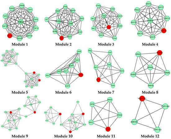 In this study, 19 high frequency targets were used to construct PIN (Figure 3) for further predicting the anti-cancer activity of GTs. The generated network contained 185 nodes (proteins) and 733 edges (relations). In order to cluster the pharmacological activity of GTs, 12 modules (Figure 4) were identified from PIN by MCODE algorithm. Functional enrichment analysis by BinGO method was shown in Table 3 to annotate potential biological function of the proteins in each module. The results showed that GTs played an essential role in pharmacodynamics with the biological processes, such as regulation of the cell division cycle, lipid metabolic process, protein acetylation, apoptotic signaling pathway, and so on. Half of the modules were related to cancer, including module 1, 3, 6, 7, and 11.