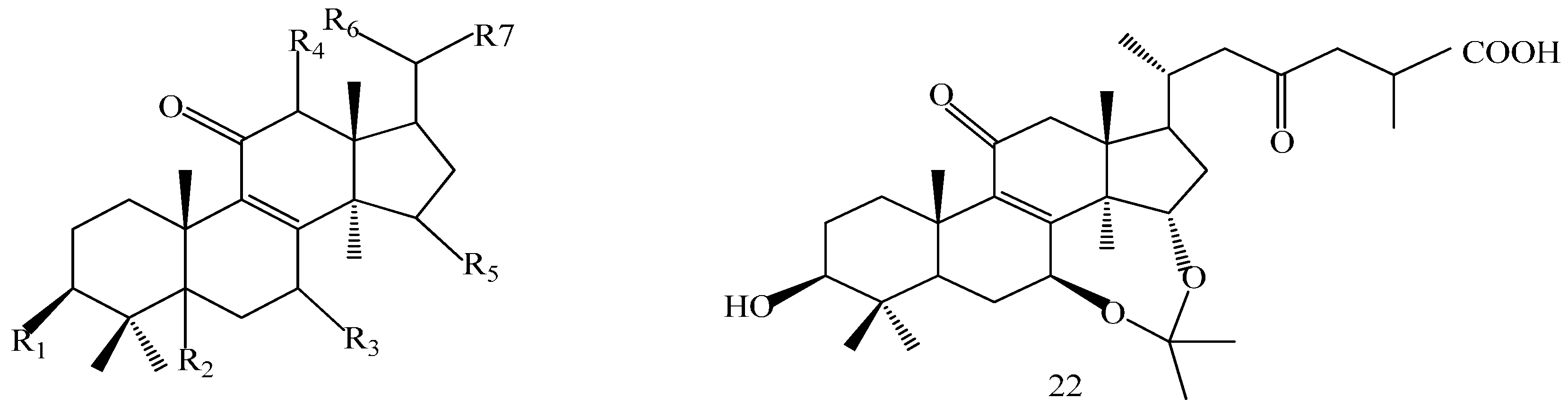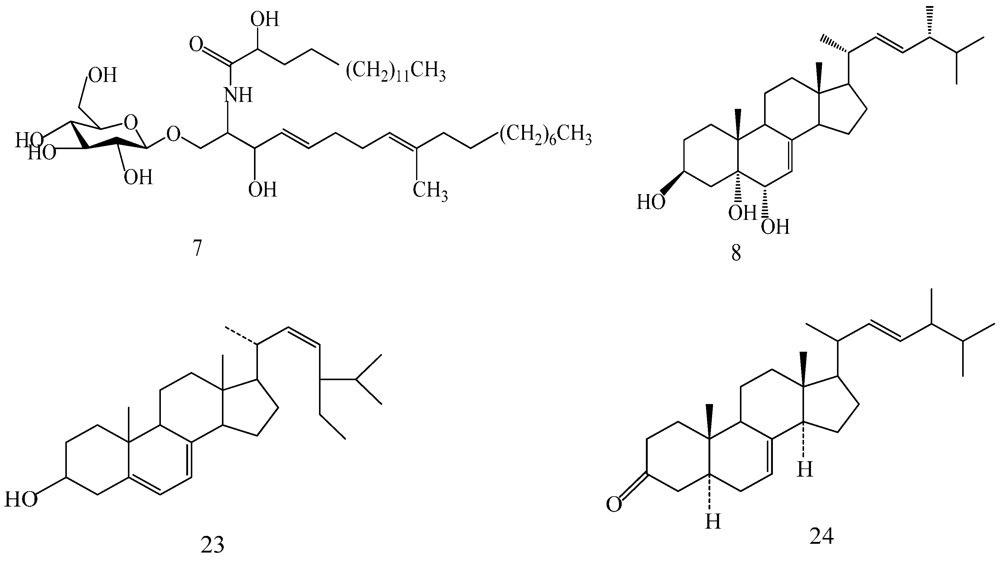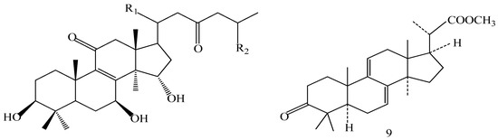 The structures of the isolated compounds were elucidated from the data obtained from 1H- and 13C-NMR spectra. 3β,7β,15β-trihydroxy-11,23-dioxo-lanost-8,16-dien-26-oic acid methyl ester (1) [28], 3β,7β,15β-trihydroxy-11,23-dioxo-lanost-8,16-dien-26-oic acid (2) [28], 3β,7β,15α,28-tetrahydroxy-11,23-dioxo-lanost-8,16-dien-26-oic acid (3) [29], ganotropic acid (4) [29], 26-nor-11,23-dioxo-5α-lanost-8-en-3β,7β,15α,25-tetrol (5) [30], (3β,7α)-3,7-dihydroxylanosta-8,24- dien-11-one (6) [31] were first reported from the species of G. lucidum. Meanwhile, (4E,8E)-N-d-2′-hydroxypalmitoyl-l-O-β-d-glucopyranosyl-9-methyl-4,8-spingodienine (7) [32] and stigmasta-7,22-dien-3β,5α,6α-triol (8) [33] were first reported from the genus Ganodema, together with 4,4,14α-trimethyl-3-oxo-5α-pregna-7,9(11)-dien-20S-carboxylate (9), lucidenic acid C (10), lucidone F (11), lucidone D (12), 7-oxo-ganoderic acid Z (13), ganosineniol A (14), ganoderic acid XL1 (15), ganoderic acid C2 (16), methyl ganoderate C (17), ganolucidic acid γa (18), methyl ganoderate C2 (19), lucidenic lactone (20), ganodericacid C (21), ganodermacetal (22) and ergosterol (23), and ergosta-7,22-dien-3-one (24).