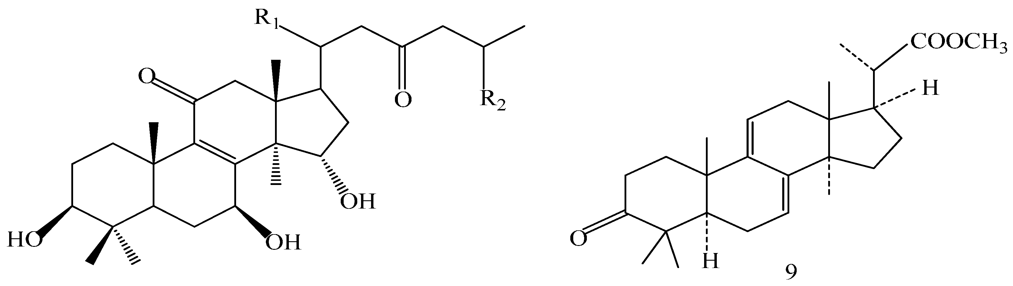 Compound 1 was obtained as a yellow oily solid, yielded a positive reaction to 10% H2SO4–EtOH reagent. 1H-NMR (CD3OD, 500 MHz) δ: 3.57 (3H, s, O-Me), 2.91 (1H, dd, J = 8.4, 17.8 Hz, H-3), 4.96 (1H, dd, J = 7.2, 9.9 Hz, H-7), 5.49 (1H, s, H-15), 5.44 (1H, s, H-16), 2.78 (1H, m, H-1), 1.61 (2H, m, H-2), 0.95 (1H, m, H-5), 1.96 (1H, dd, J = 7.6, 17.6 Hz, H-6), 3.12 (1H, d, J = 15.0 Hz, H-12), 3.02 (1H, d, J = 15.0 Hz, H-12), 2.50 (1H, m, H-20), 2.54 (1H, dd, J = 6.8,16.6 Hz, H-22), 2.40 (1H, m, H-24), 2.73 (1H, m, H-25), 1.25 (3H, s, H-18), 1.22 (3H, s, H-19), 1.02 (3H, d, J = 6.4 Hz, H-21), 1.11 (3H, d, J = 7.1 Hz, H-27), 1.03 (3H, s, H-28), 1.01 (3H, s, H-29), 1.02 (3H, s, H-30); 13C-NMR (CD3OD, 125 MHz) δ: 34.77 (C-1), 28.65 (C-2), 77.03 (C-3), 39.24 (C-4), 49.52 (C-5), 28.59 (C-6), 69.32 (C-7), 161.39 (C-8), 141.47 (C-9), 39.20 (C-10), 199.79 (C-11), 46.65 (C-12), 51.56 (C-13), 56.48 (C-14), 77.43 (C-15), 123.89 (C-16), 154.22 (C-17), 22.46 (C-18), 19.62 (C-19), 27.78 (C-20), 20.22 (C-21), 48.54 (C-22), 207.57 (C-23), 48.29 (C-24), 35.27 (C-25), 176.17 (C-26), 16.99 (C-27), 28.83 (C-28), 16.65 (C-29), 23.46 (C-30), 52.10 (C-O-Me).