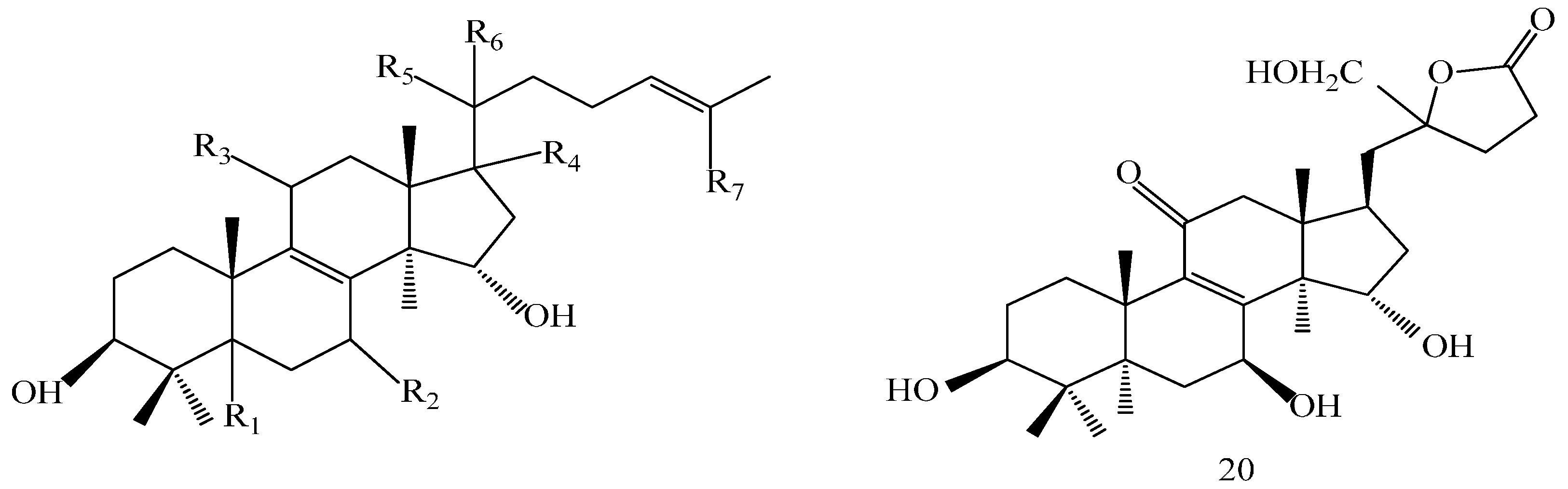 Compound 5 was obtained as a white solid, yielded a positive reaction to 10% H2SO4–EtOH reagent. The structure was the same as that of compound 1, except for its the degradation of the carboxyl group and the attachment of a hydroxyl group to C-25 and opposite stereoconfiguration of chiral C-15, with its more than two H atoms of C-16 and C-17. 1H-NMR (DMSO-d6, 500 MHz) δ: 3.20 (1H, dd, J = 5.2, 11.0 Hz, H-3), 4.42 (1H, dd, J = 7.3, 9.8 Hz, H-7), 4.68 (1H, t, J = 15.8 Hz, H-15), 4.12 (1H, m, H-25), 1.81 (2H, m, H-16); 13C-NMR (DMSO-d6, 125 MHz) δ: 78.07 (C-3), 67.39 (C-7), 160.72 (C-8), 140.89 (C-9), 199.45 (C-11), 70.5 (C-15), 36.57 (C-16), 47.89 (C-17), 213.84 (C-23), 76.39 (C-25).