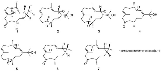 Roy, P.K.; Ashimine, R.; Miyazato, H.; Taira, J.; Ueda, K. New Casbane and Cembrane Diterpenoids from an Okinawan Soft Coral, Lobophytum sp. Molecules 2016, 21, 679. https://doi.org/10.3390/molecules21050679