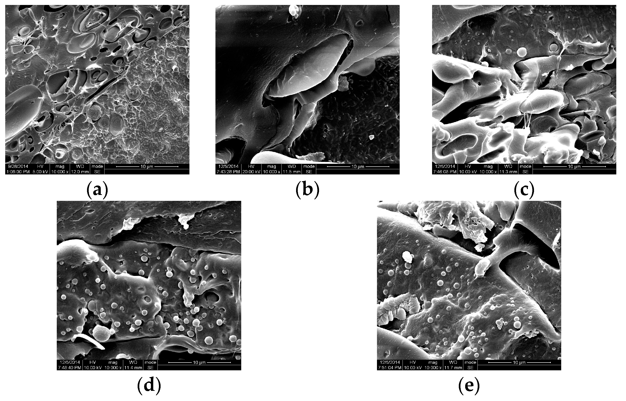 SEM can provide a better understanding of the relationships between the water vapor transmission, mechanical properties and the film’s structural characteristics. The effect of OEO dispersion into the polymer matrix can be observed in Figure 1b–e.