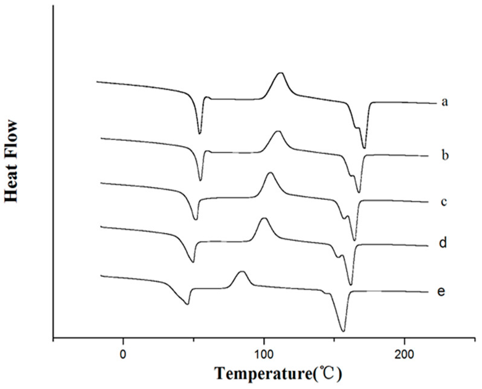Differential scanning calorimetry curves of poly (lactic acid)/poly(trimethylene carbonate)/oregano essential oil composite films (a) PLA/PTMC; (b) PLA/PTMC/O3; (c) PLA/PTMC/O6; (d) PLA/PTMC/O9 and (e) PLA/PTMC/O12.