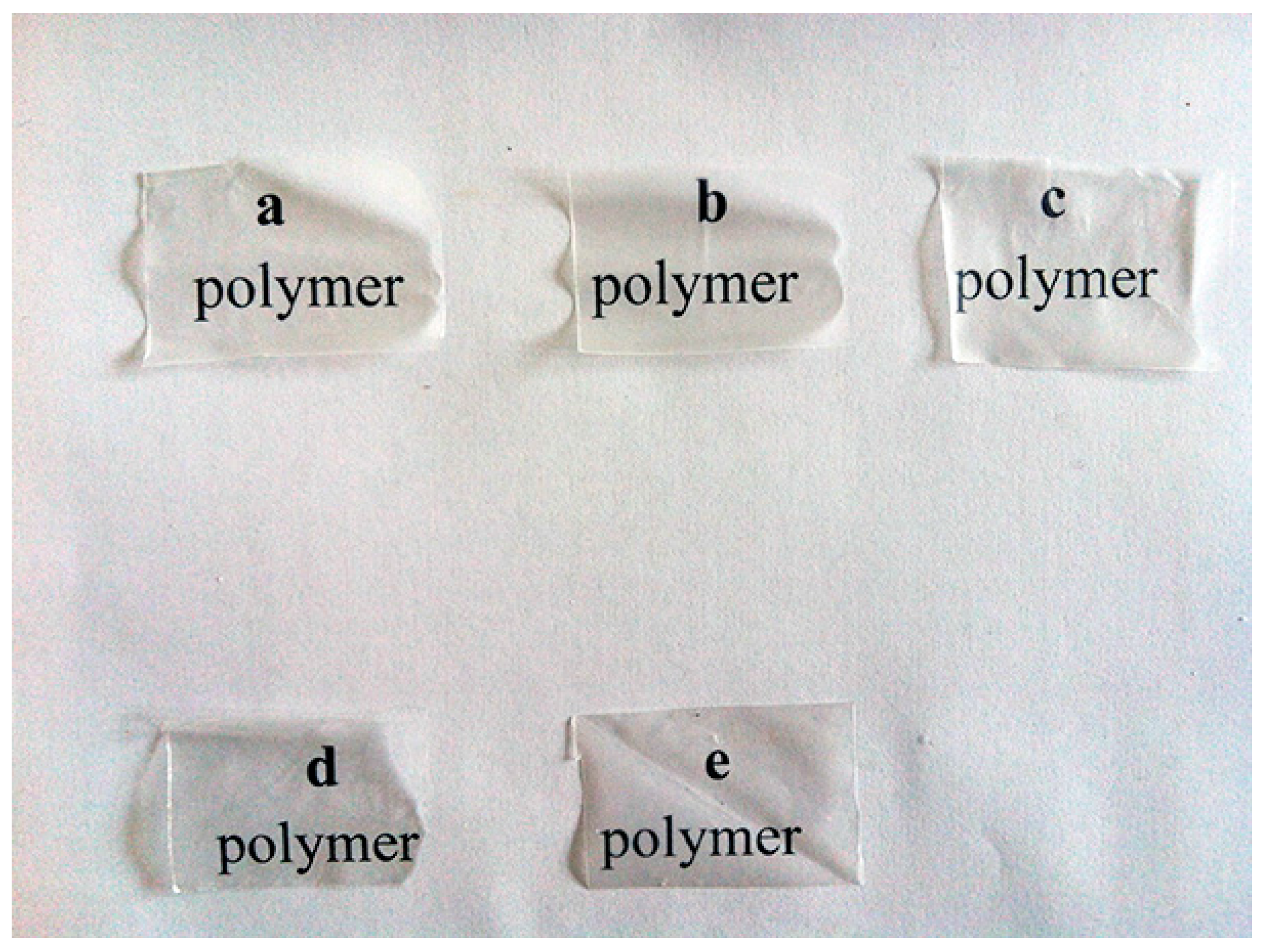 Color of (a) PLA/PTMC; (b) PLA/PTMC/O3; (c) PLA/PTMC/O6; (d) PLA/PTMC/O9 and (e) PLA/PTMC/O12.
