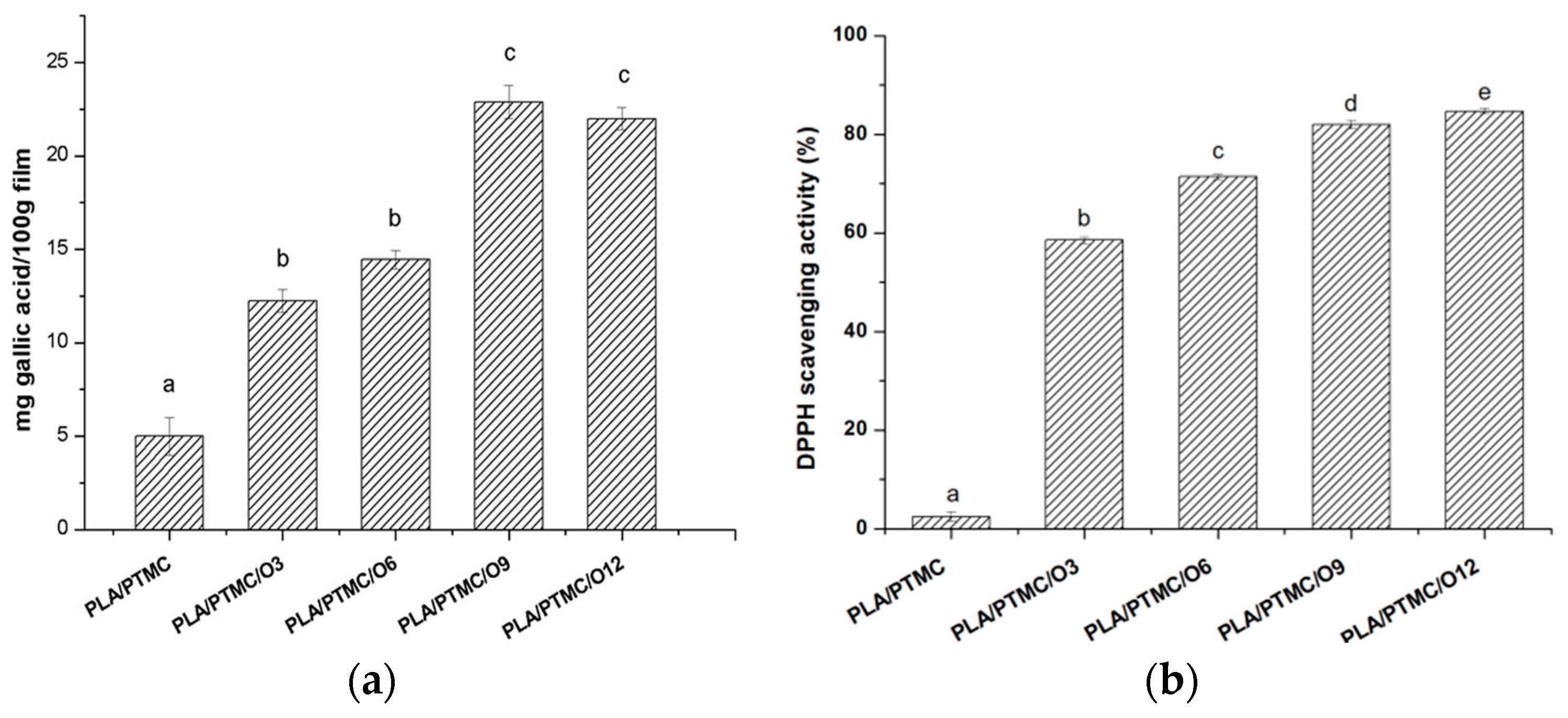 (a) Total phenolic content of PLA/PTMC, PLA/PTMC/O3, PLA/PTMC/O6, PLA/PTMC/O9 and PLA/PTMC/O12; (b) DPPH scavenging activity of PLA/PTMC, PLA/PTMC/O3, PLA/PTMC/O6, PLA/PTMC/O9 and PLA/PTMC/O12. Values followed by different letters (a–e) were significantly different (p < 0.05).