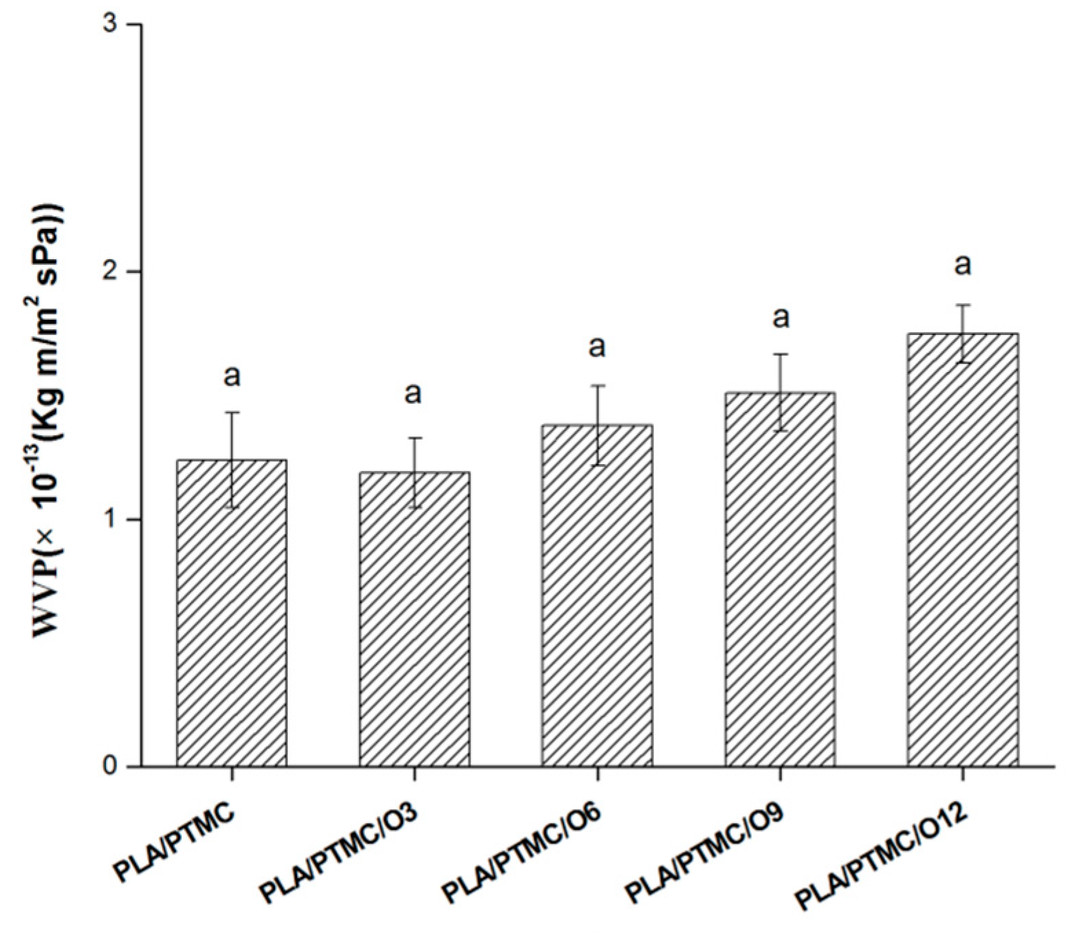 Water vapor permeability (WVP) of PLA/PTMC, PLA/PTMC/O3, PLA/PTMC/O6, PLA/PTMC/O9 and PLA/PTMC/O12 film. Values followed by same letter (a) was not significantly different (p > 0.05).