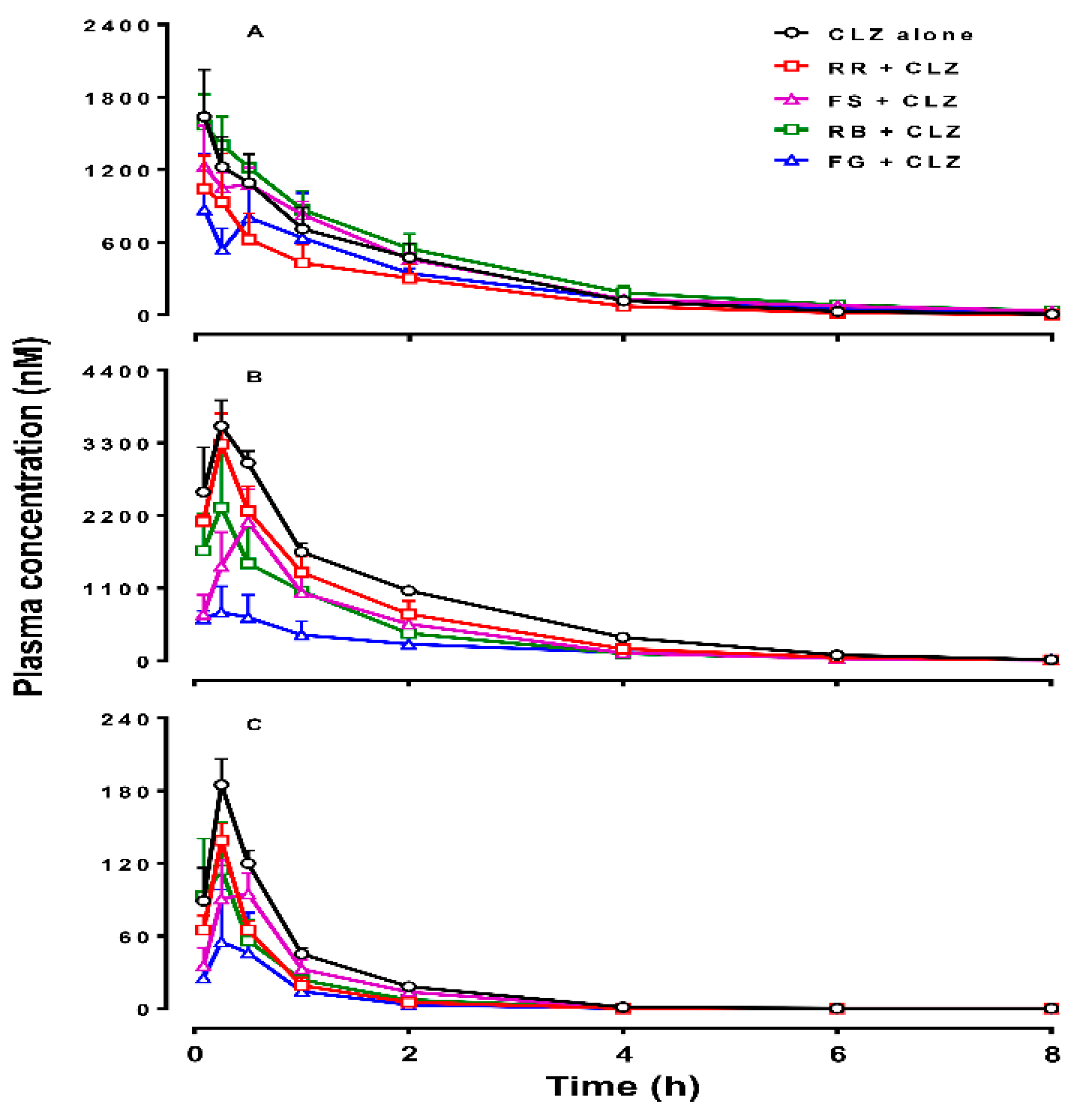 Plasma concentrations of clozapine (CLZ, A), norclozapine (norCLZ, B), and clozapine N-oxide (CLZ N-oxide, C) over time in rats treated with an intraperitoneal dose of 10 mg/kg of CLZ alone (n = 5), or pretreated orally with Radix Rehmanniae (RR; n = 4), Fructus Schisandrae (FS; n = 6), Radix Bupleuri (RB; n = 6), and Fructus Gardeniae (FG; n = 4), respectively. The data are presented as mean ± SEM.