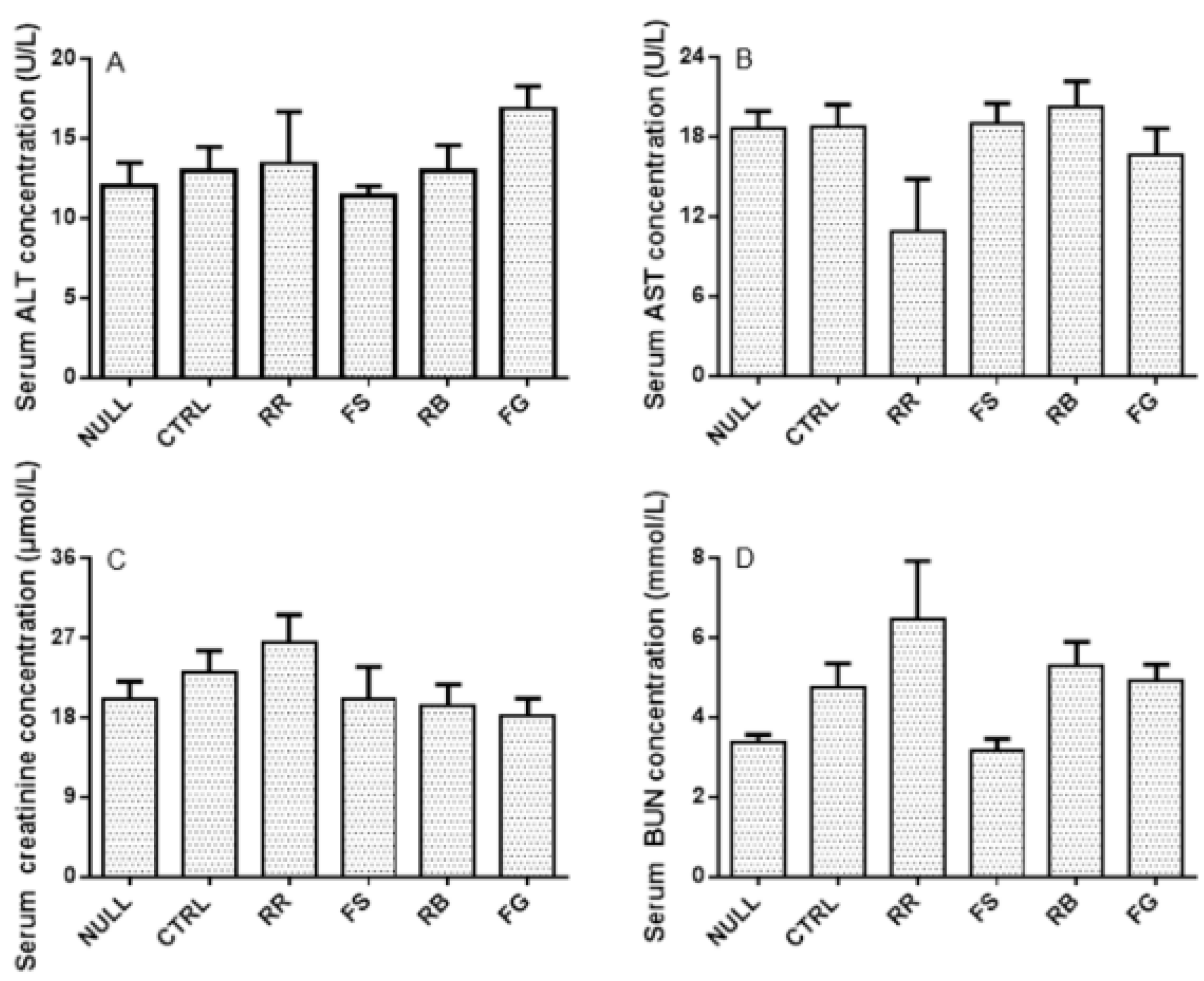 All of the procedures for determining AST, ALT, CR, and BUN levels were exactly the same as the protocols provided by the manufacturers.