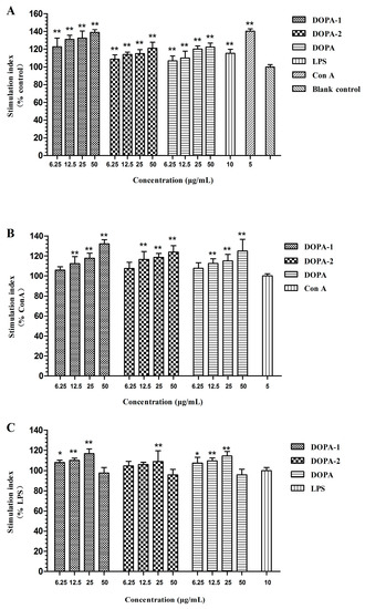 2.3. Effects of D. officinale Polysaccharides on Activivation of Splenocytes