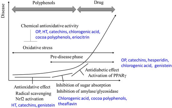Most polyphenols inhibit amylase and glycosidase activity and, thus, inhibit glucose absorption in the intestine. In addition, polyphenols activate PPARγ and promote adiponectin production, thus subsequently improving insulin resistance. The antioxidative properties and antidiabetic efficacy of polyphenols are independent of each other and their interrelationship is still unclear. Nonetheless, in pre-symptomatic states, polyphenols contribute to the prevention of the type 2 diabetes through antioxidative activity. In the early phase of type 2 diabetes, polyphenols alleviate symptoms through PPARγ activation and inhibition of glucose absorption (Figure 2). Understanding the interaction of the antioxidant activities and antidiabetic effects of polyphenols will need to be clarified in the future. This will require effective means to measure the chemical antioxidative activity of polyphenols in vivo, which currently remain a significant challenge.
